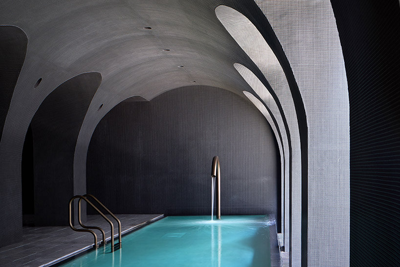 the blackened, textural facade wraps the public park on three sides | image © designboom
