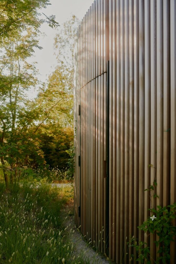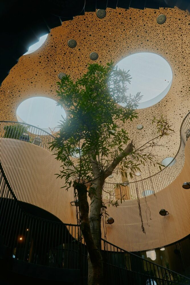 the project sits like a ring placed over the terrain, with its funnel-like roof forming a shaded perimeter walkway and an introverted core.
