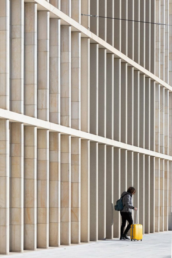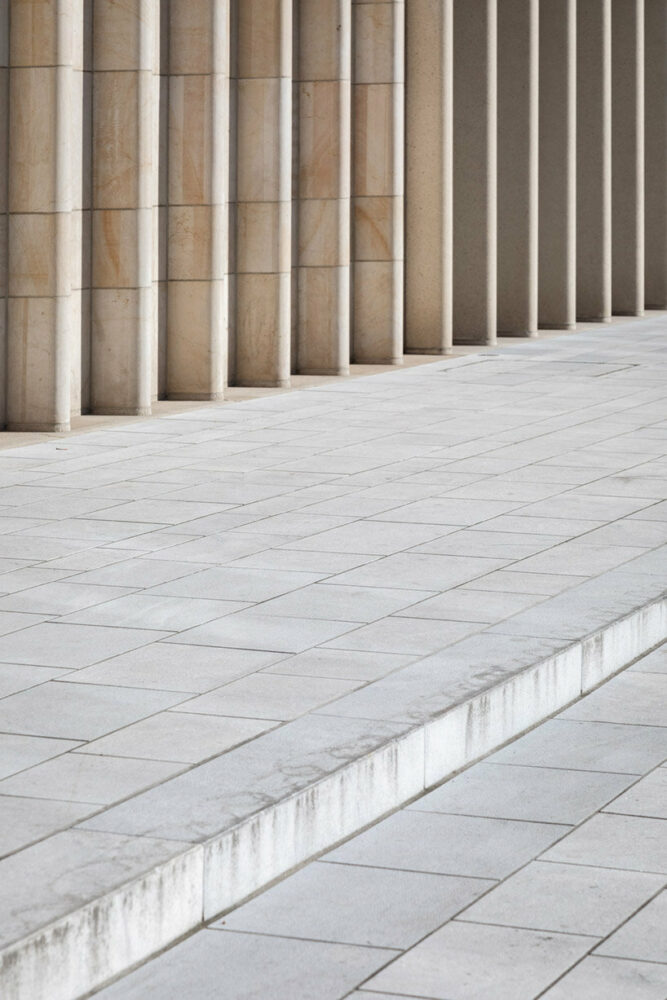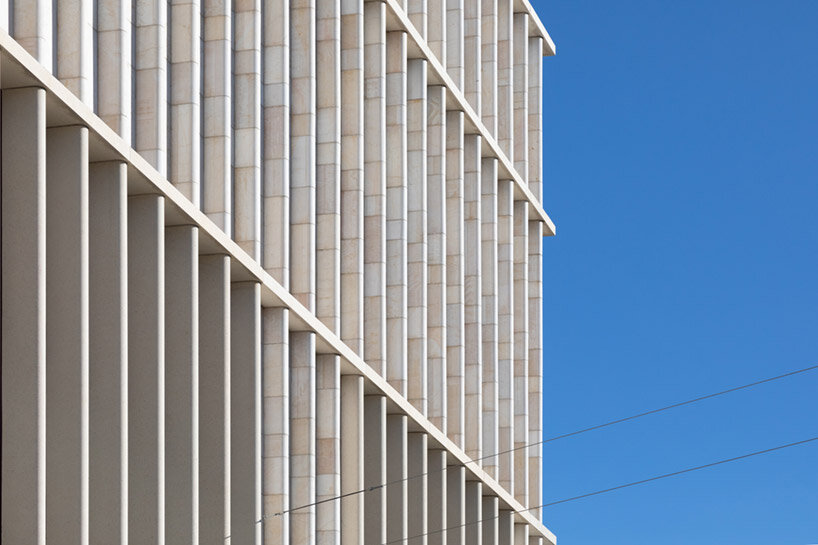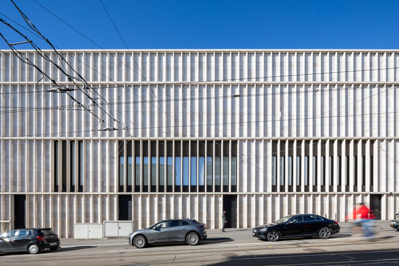david chipperfield architects berlin says that the urban concept for the kunsthaus zürich extension, captured here by vincent hecht, envisaged the placement of a clear geometric volume on the northern edge of the square. the project’s architectural identity is modeled on traditional stone façades, as found in the existing kunsthaus and many other significant public buildings in the city. the new building combines tradition and innovation through slender vertical fins crafted from local jurassic limestone with sawn surfaces placed at regular intervals in the façade.