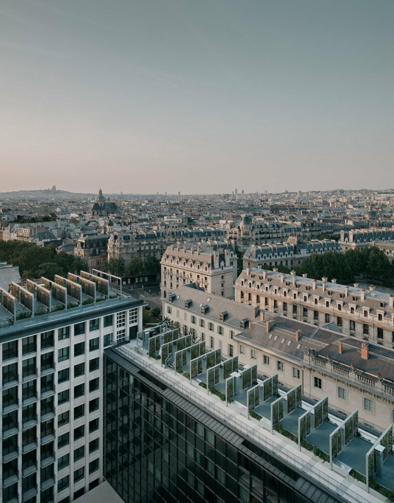 The complex accommodates a wide range of functions including upscale and affordable housing, a hotel, a youth hostel, offices, retail, a gallery, a food market, and a childcare facility. The two top floors, which were only accessible for a few years following the completion of the original building, are now open again for the public to enjoy. Boasting panoramic views of the French capital, these upper levels house a bar and a restaurant, as well as an inhabitable art installation by Ólafur Eliasson and Sebastian Behmann from Studio Other Spaces Berlin.david chipperfield completes mixed-use complex morland mixité capitale in paris