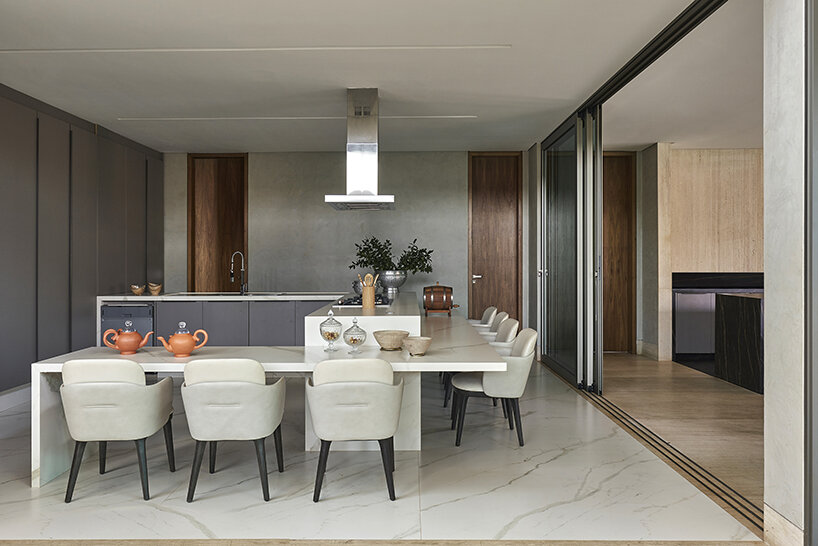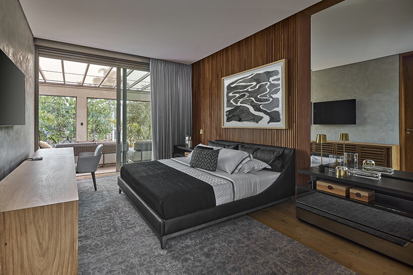 From white and gray to brown, caramel, and black, Guerra used a rich palette of colors to echo spatial and generational diversity. Materials-wise, a mix of natural (wood, stone) and industrialized (dekton) elements bring warmth, comfort, and efficiency to the overall structure. ‘In furniture, meanwhile, we seek timelessness for a long-lasting home that will transcend fashions and trends,’ he notes. The owners also decided to purchase an additional 15,000 sm plot next door to build a sports square complete with a soccer field, tennis court, multi-sport court, and two beach tennis courts.