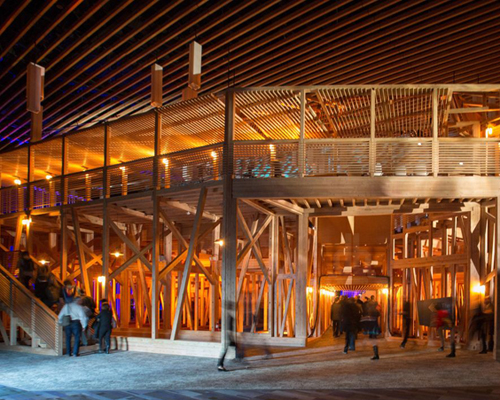 TED, the nonprofit enthusiastic to ‘ideas worth spreading’, has invited the rockwell group to build the stage for the 30th anniversary of the conference, in vancouver. set in the vancouver convention centre, the portable and temporary theater is constructed with 600 pieces and assembled onsite for the five day festival. the intimacy of the space is realized by instilling a sense of community while having singularity in form. the individual and the collective are showcased in unison as the arena becomes a manifestation of the organization’s core principles. in addition to david rockwell’s observations, from being an attendee over the years, further inspiration for the theater was gathered from historic organizational spaces such as campfires and other non permanent commons. comprised mostly from locally harvested douglas fir wood sourced from the pacific northwest, the seating ‘bowl’ also includes a walkway along the perimeter with lattice-like platforms and handrails. 16 different seating options are present, and vary from lounge groupings, rows of benches, and beanbags. a standing room area in the back allows viewers to access personal electronic devices, without disturbing the rest of the audience. aided by an electronic cutting machine, the event construction company, nussli, fashioned the structure (along with the custom furniture and steelcase fabrication) to be easily disassembled back into 8’ x 10’ x 12’ boxes, and possibly reused for upcoming events.