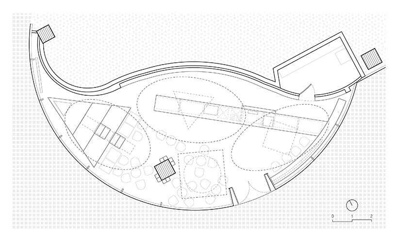the original volume of the café had an irregular, streamlined shape that offered a wide view from the terrace, and had an impressive height of about 4.8 meters. the starting point for dazhou and associates (DAA), therefore, was to make full use of that ceiling height all while creating an experience suitable for exploration and conversation. when it came to spatial organization, the irregular plan did not allow for too much division – and to overcome that constriction, the architects designed four elliptical structures from top to the bottom that visually separate the café into four different rooms and functions without the need for partitions.