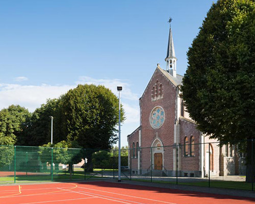 ‘campus ruiselede’ sits amongst a vista of farmland in the belgian province of west flanders. part of the community institution de zande, the structure serves as a school house for boys between 12 and 18 years old. on the edge of the property is a chapel, which has been converted into one of the school’s principle amenities and houses indoor sports facilities, a media center, and extra classroom settings. architect rob hootsmans of dutch firm de architekten cie. was placed in charge of the refurbishment, and worked under flemish master builder marcel smets to ensure the structure — built in 1856 — remained as historically unchanged as possible.