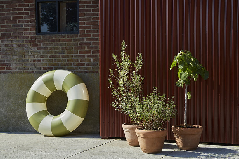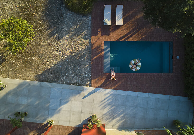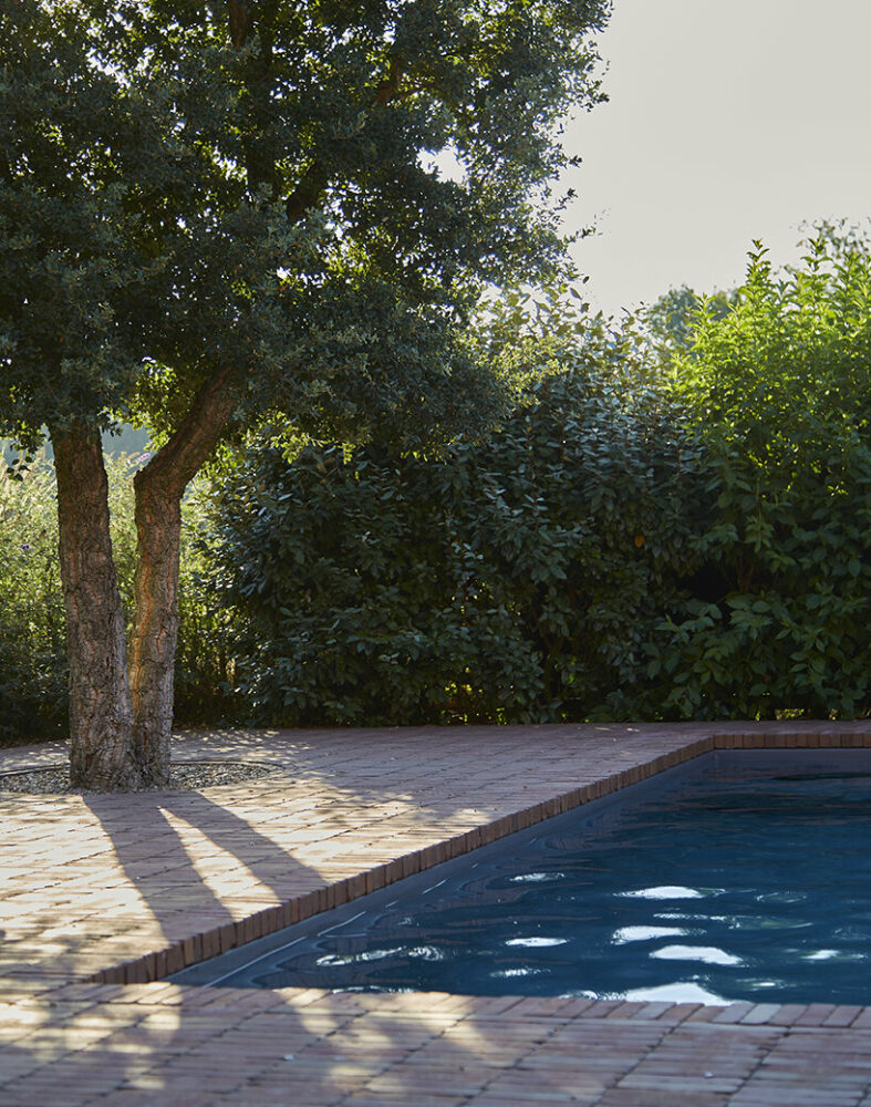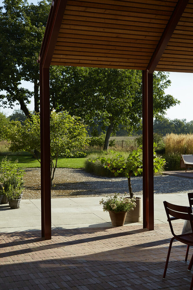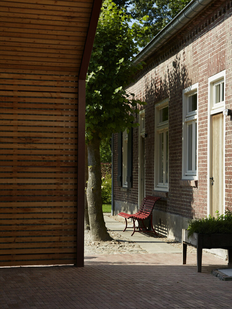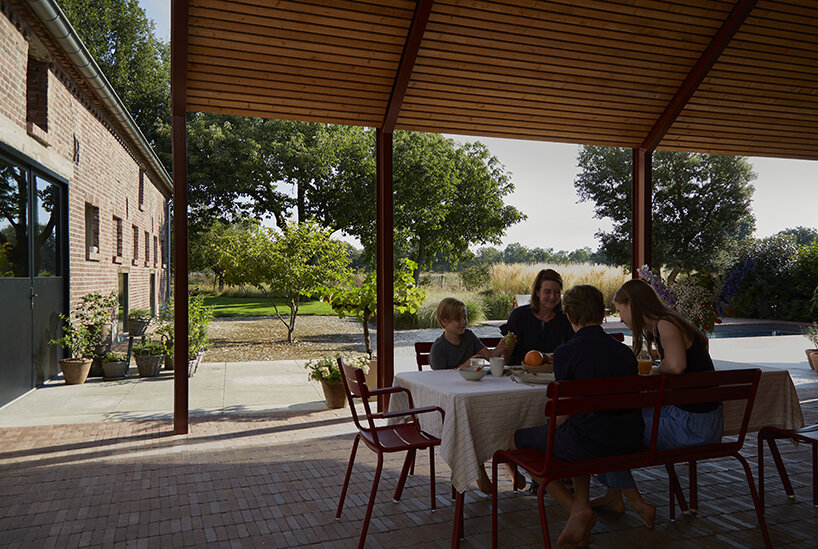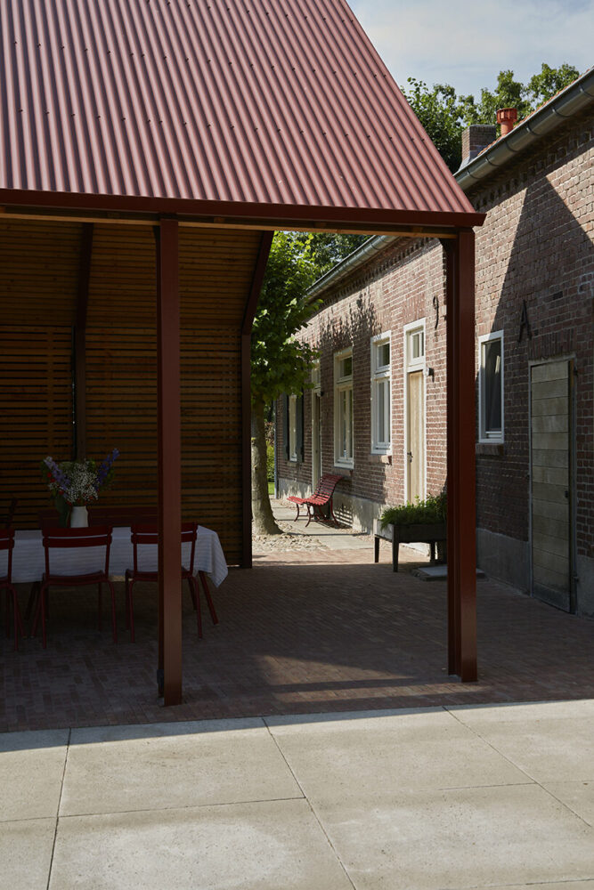 Construction-wise, ‘the design refers to the pragmatics of the rural shed. The beauty lies in the details,’ adds the team at De Nieuwe Context. To start, the structure is bordered by concrete slabs that follow the lines of the original building and extend seamlessly to reach the swimming pool, where the ground suddenly switches to red brick tiling. Both new flooring materials gently contrast the existing stone pavement dominating both yards. As for the steel framework — painted in red lead to prevent rust — its corrugated sheet texture continues into the gutter and from the inside, Siberian larch wood, a light, and affordable material clads the roof for proper insulation.