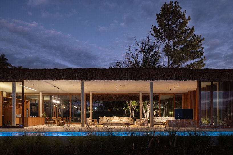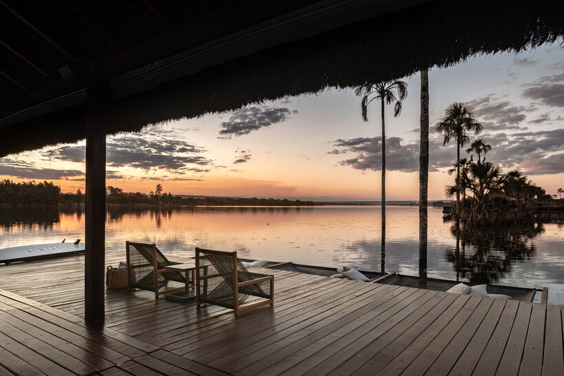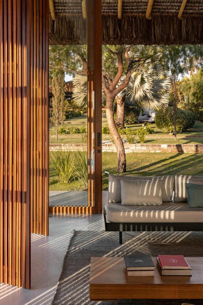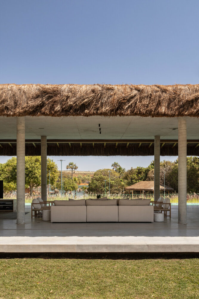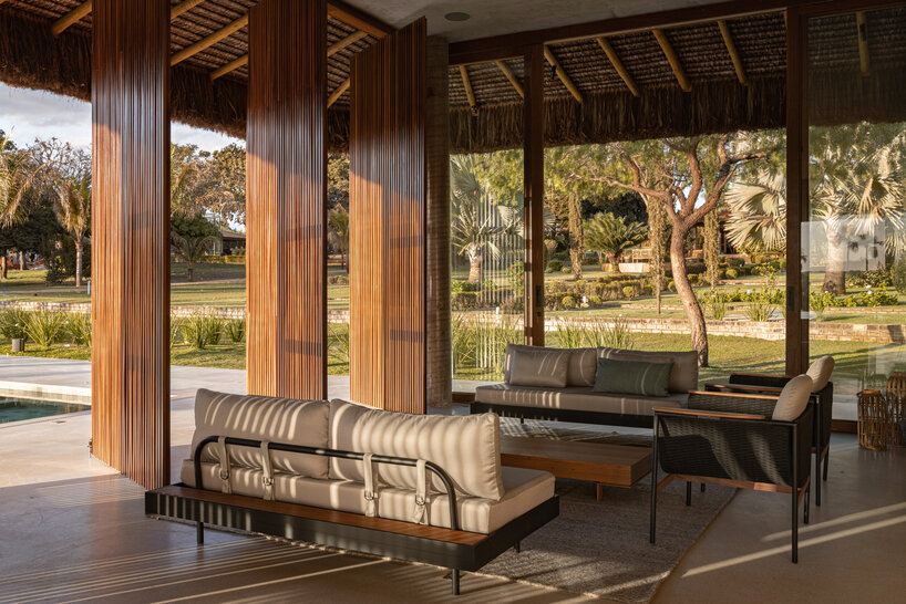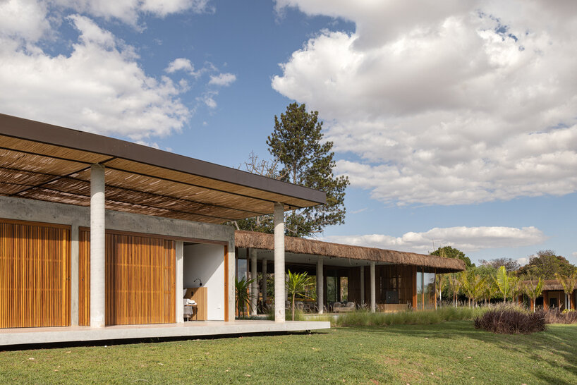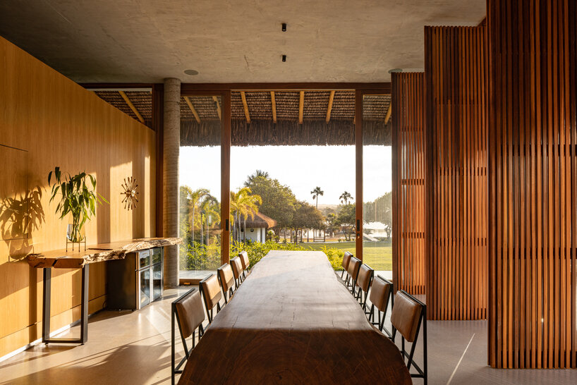 the project sits like a ring placed over the terrain, with its funnel-like roof forming a shaded perimeter walkway and an introverted core.