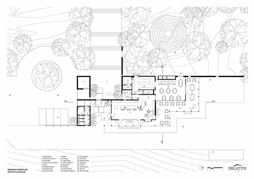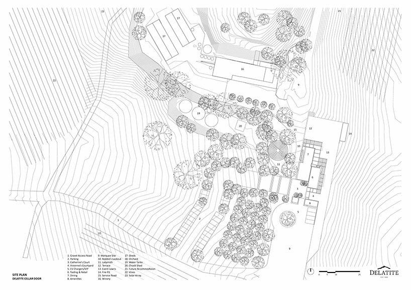 the project sits like a ring placed over the terrain, with its funnel-like roof forming a shaded perimeter walkway and an introverted core.