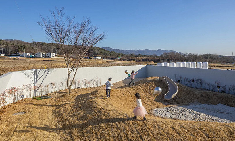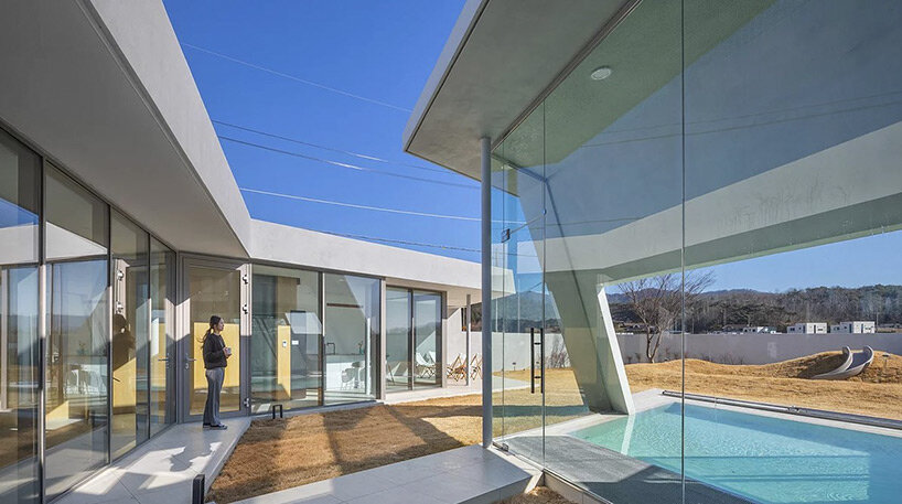 architecture firm rieuldorang atelier introduces ‘marea house’, a playful pension situated in gyeongju, korea. with the site neighboring several residential projects and hotels, the architects decided to differentiate the design and make it stand out among its surroundings. therefore, they came up with the idea of shifting the perspective from a simple stay to play, generating a spacious living environment with clean, eye-catching geometries, and incorporating an additional pool area, courtyard, and playground.