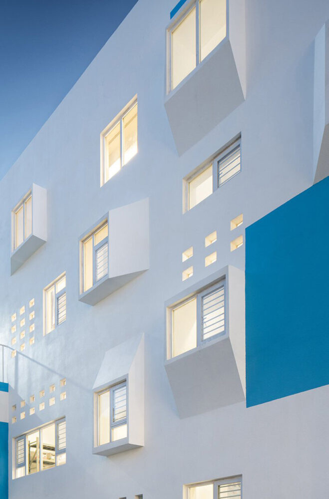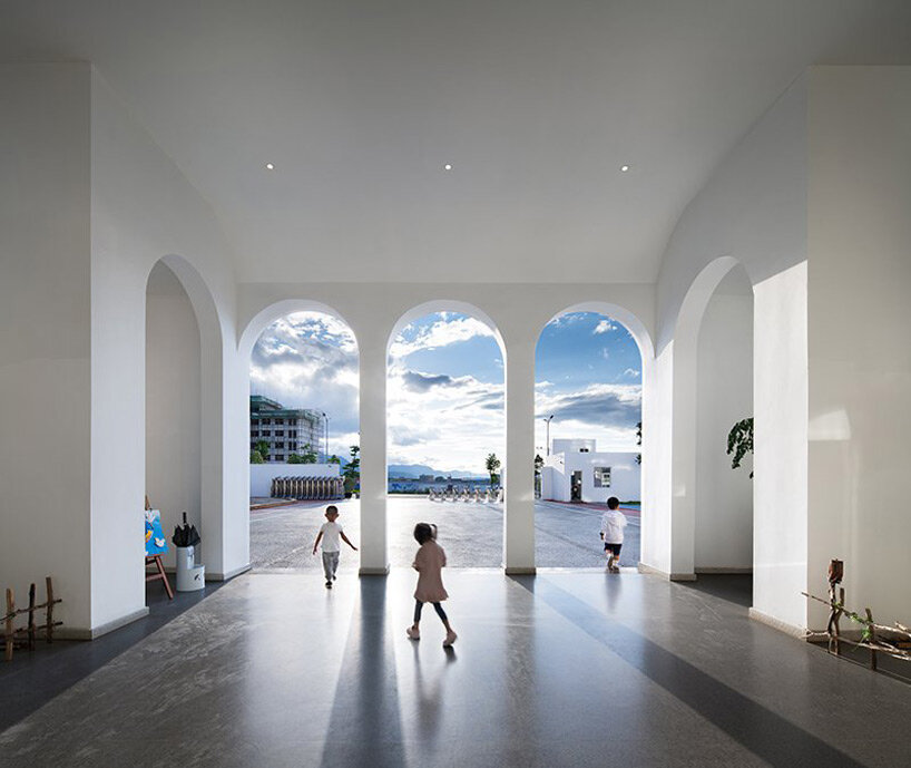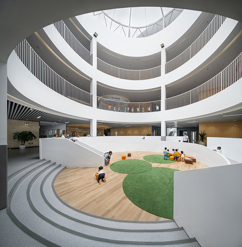 the project sits like a ring placed over the terrain, with its funnel-like roof forming a shaded perimeter walkway and an introverted core.