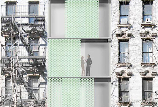diller scofidio + renfro have designed ‘nolita townhouse’ located in new york city. the seven story silver building bridges the last remaining gap between twin tenements in the neighbourhood. the 10 000 square foot construction contains two duplex apartments, a simplex and two levels of retail at the street. in order to bring natural light into the narrow and deep building lot, the east – facing street facade is floor-to-ceiling glass. to satisfy local restrictions, the curtain wall is veiled by a system of operable, glass masonry screens. custom made glass bricks in a running bond pattern with staggered voids are threaded on rods like beads and suspended from tracks in front of the glass wall at every floor slab. these hefty textile screens can be drawn mechanically by tenants like grand mineral curtains. light and view can be regulated by overlapping the brick curtains to various degrees of porosity. the open floor apartments utilize built in furniture and transformable wall elements to maximize the use and perceptual space of the units.