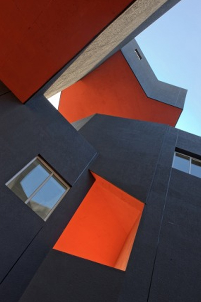 taking into consideration the daily activities of its residents, specific height dimensions were implemented: 6 metres in height for studio rooms and 3 metres in height for living areas. a minimalist rectangular shaped room was chosen for studio spaces while bedroom, kitchen and bathrooms areas were built more geometrically complex. the exterior façade is mostly dark grey concrete with a touch of orange. these colors are reminiscent of both the area’s industrial link. the 20 units are organized like stacking containers, as a homage to the site’s previous