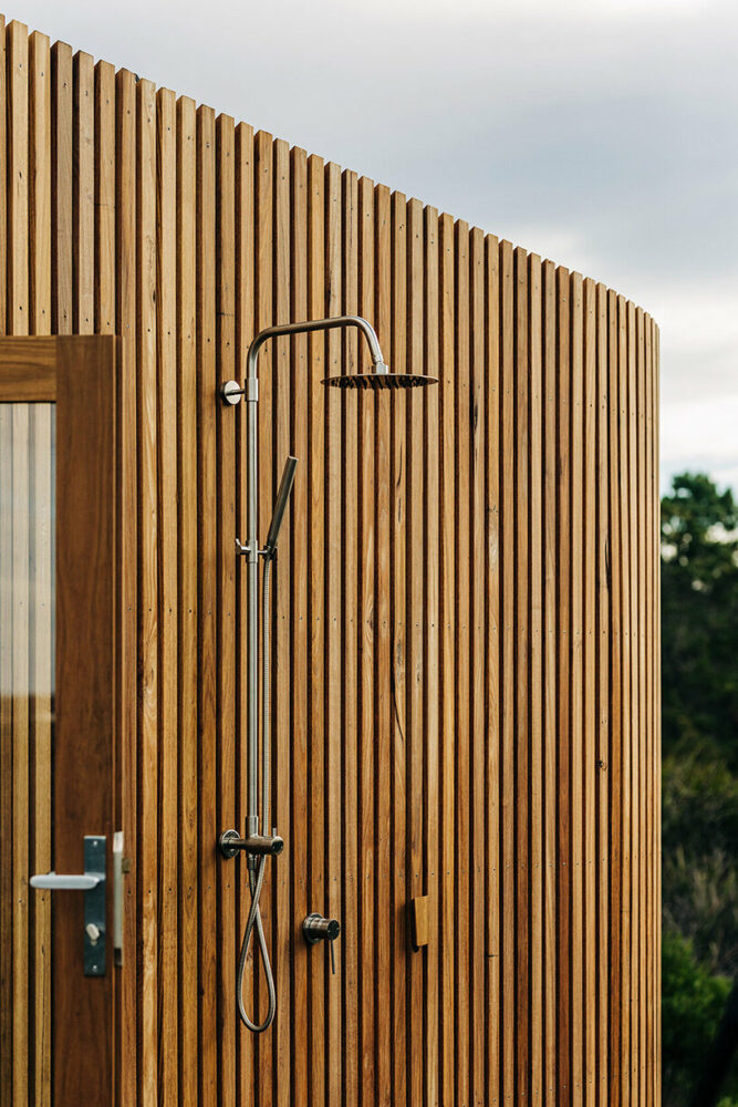 the small footprint of matt williams’ dolphin sands studio ensures both a sustainable existence and comfort within a tiny space. the project certainly makes the most of its compact design, and even integrates an outdoor shower on the deck to complement the indoor bathroom. the interiors emphasize this simple lifestyle with a material palette of oriented strand board. the exposed OSB create an atmosphere of raw minimalism with rich textures that effortlessly blend into the natural backdrop.