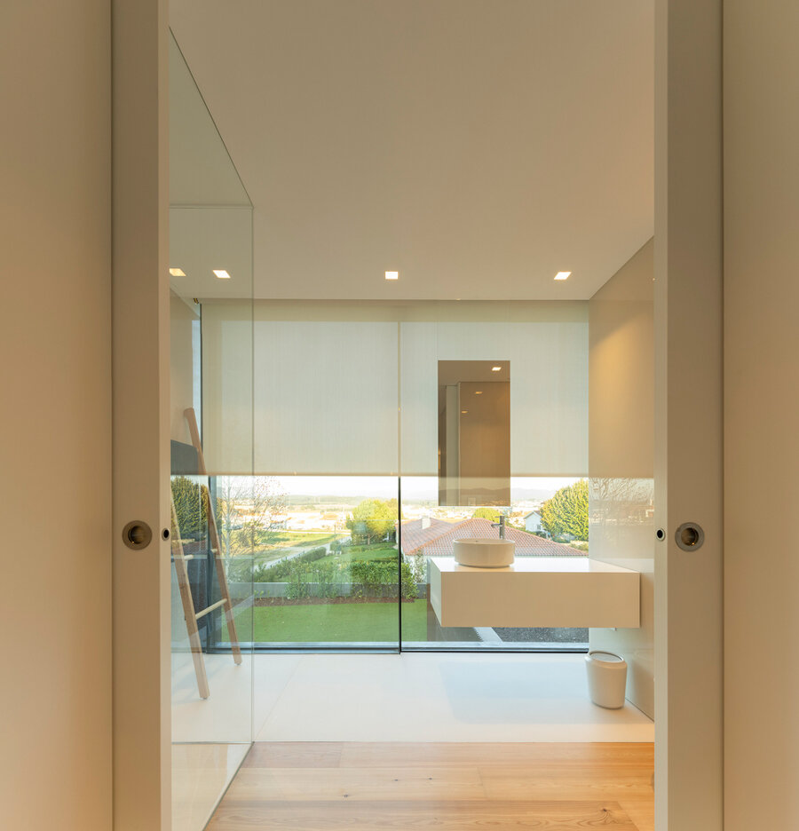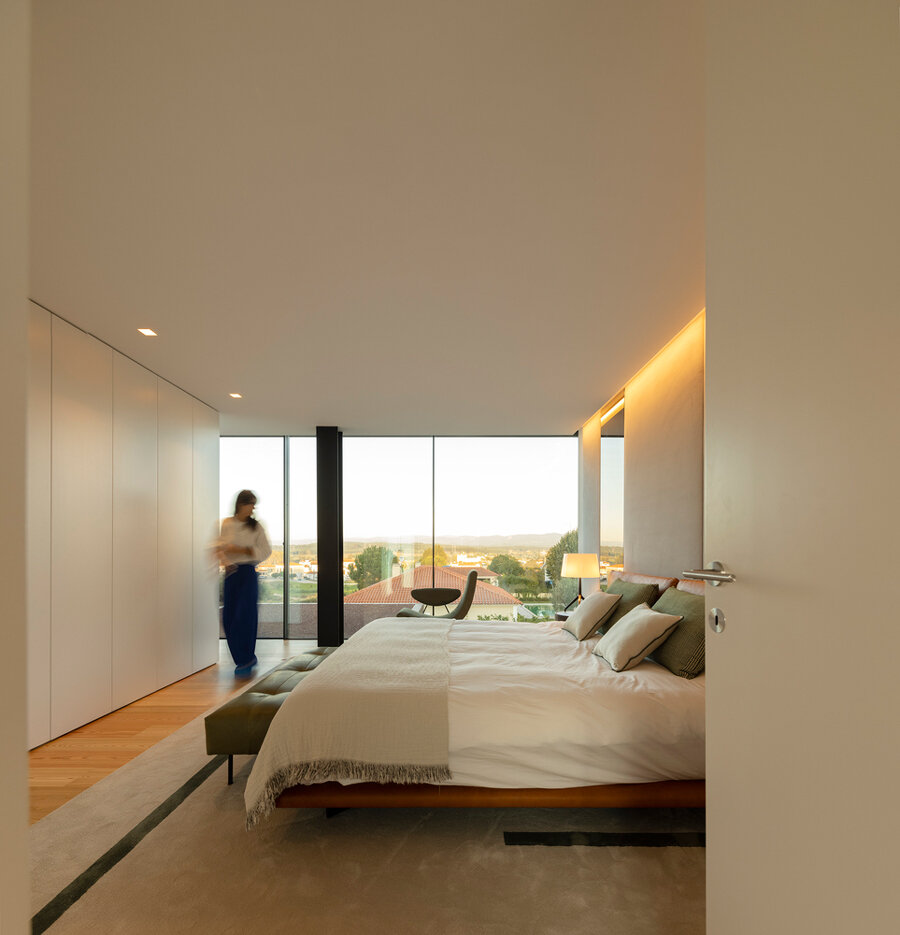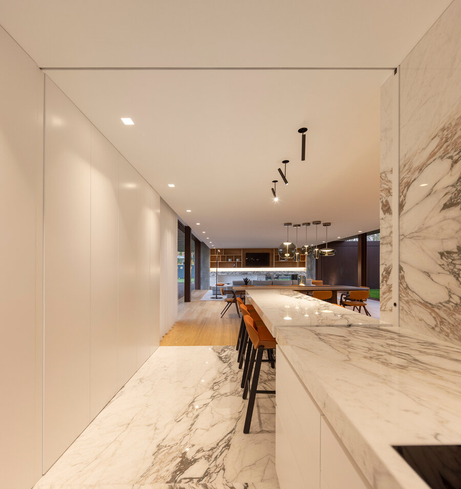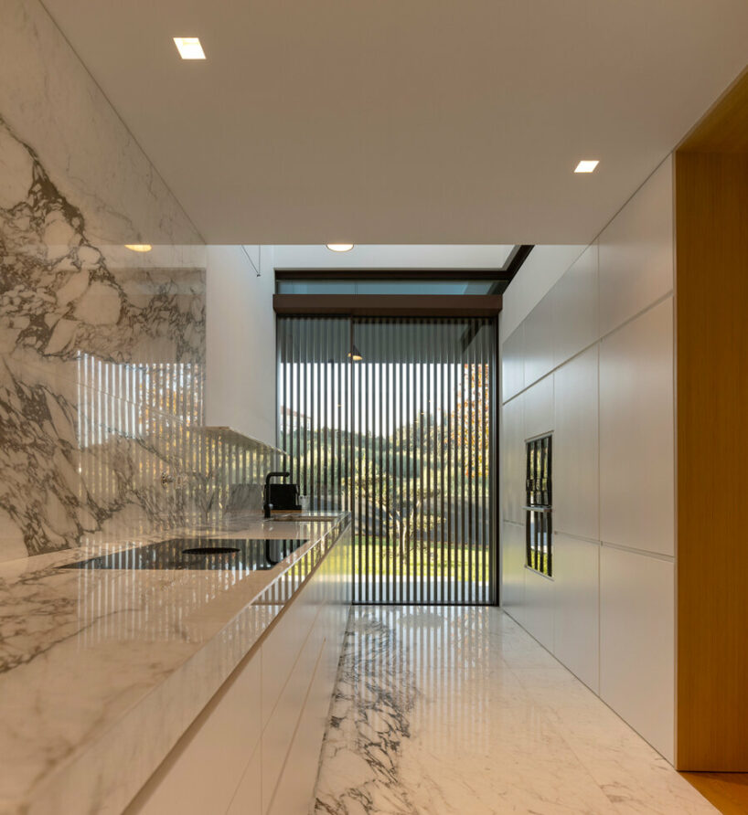 the circulation area, bathed in natural light, creates a visual dialogue with the lush surrounding gardens