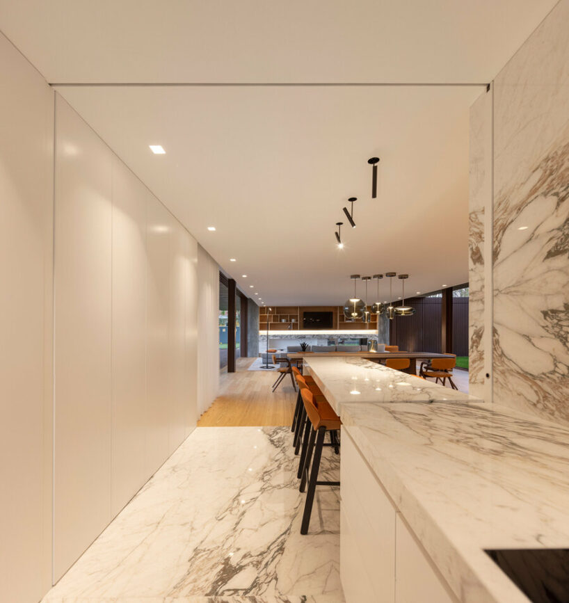 The circulation area, featuring a linear staircase beneath a skylight and benefiting from a double-height ceiling, establishes a visual connection with the surrounding gardens. The design team at Visioarq employs a minimalist palette, incorporating exposed concrete pergolas, excavated porches, lacquered aluminum slats, large sheets of black lacquered matte glass, and folding aluminum shutters. These elements artfully dissolve the boundaries between interior and exterior, utilizing intermediate spaces with varying permeability and light exposure. In this tactful play of architectural elements, invisible frame sliding windows by panoramah! contribute to the aesthetic language of modern tradition that is evident throughout the design.