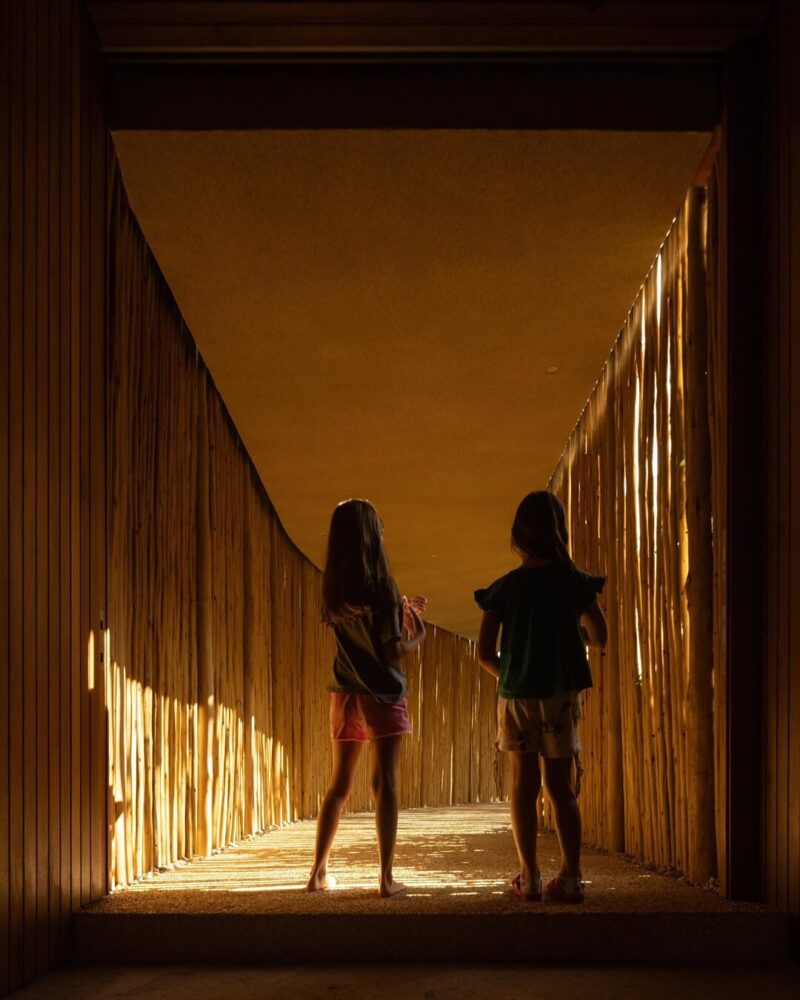 the project sits like a ring placed over the terrain, with its funnel-like roof forming a shaded perimeter walkway and an introverted core.