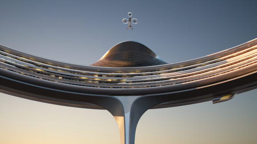 the project sits like a ring placed over the terrain, with its funnel-like roof forming a shaded perimeter walkway and an introverted core.