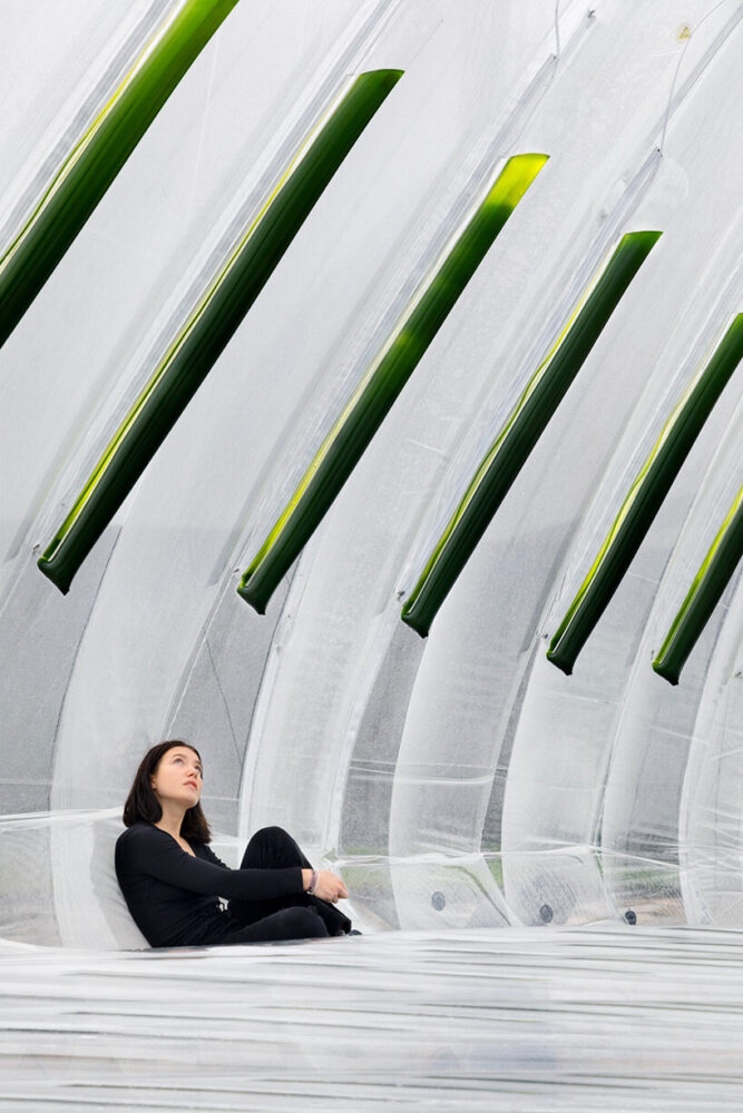 with this project, the london-based studio seeks to encourage visitors, and especially children, to directly experience the air cleaning capabilities of microalgae cultures, while immersing themselves in a bubble of freshly metabolized oxygen. the playful and soft character of the organic structure reminds of a gigantic bouncy jellyfish, while serving as a direct manifestation of the biotechnology it incorporates.