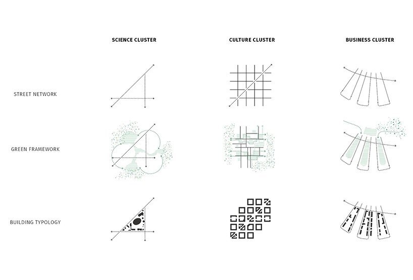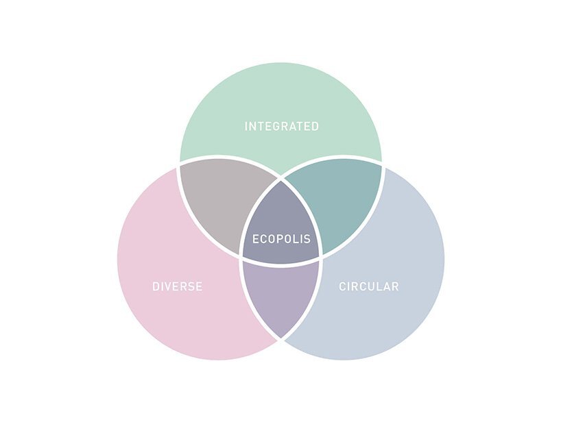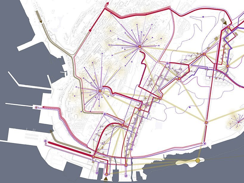 the project sits like a ring placed over the terrain, with its funnel-like roof forming a shaded perimeter walkway and an introverted core.