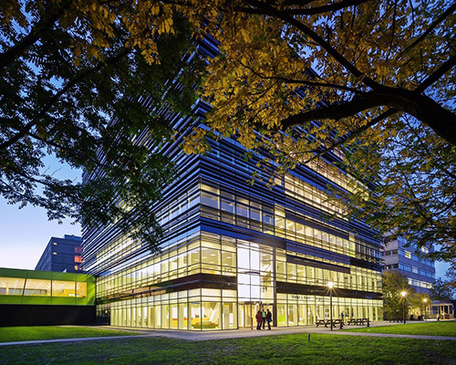 the exterior was made as transparent as possible, with attention paid to views, levels of incidental light, orientation, and energy economy. vertical blinds mounted to the façade are different in slat width, spacing, and number based on their location. as a result, the ‘victor J. koningsberger’ building has very low net energy consumption, has plentiful sunlight intake, and offers splendid views to the rest of campus.