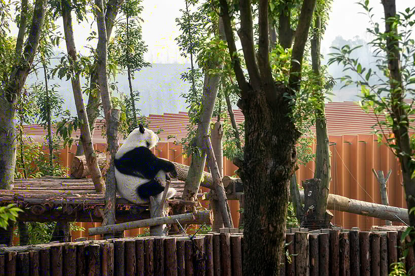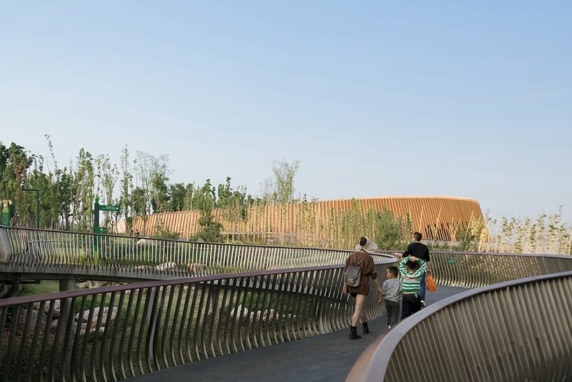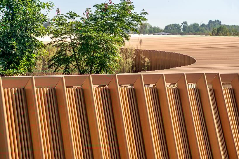 the project sits like a ring placed over the terrain, with its funnel-like roof forming a shaded perimeter walkway and an introverted core.