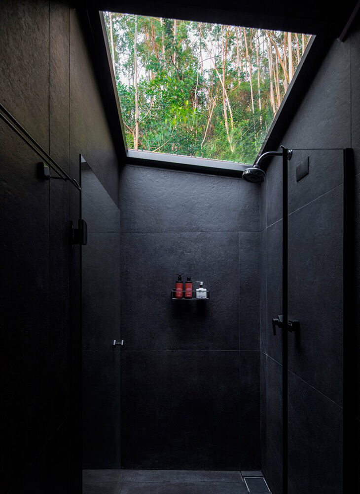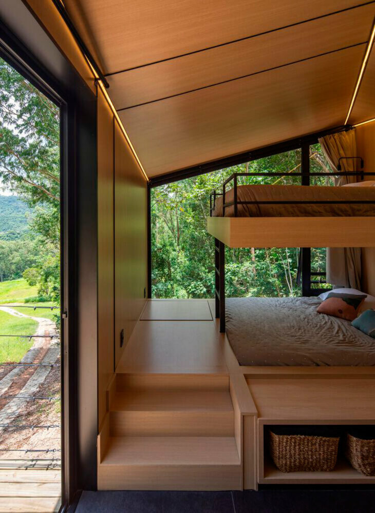the living space is adjacent to a large opening to enhance visual connections and immerse guests in nature