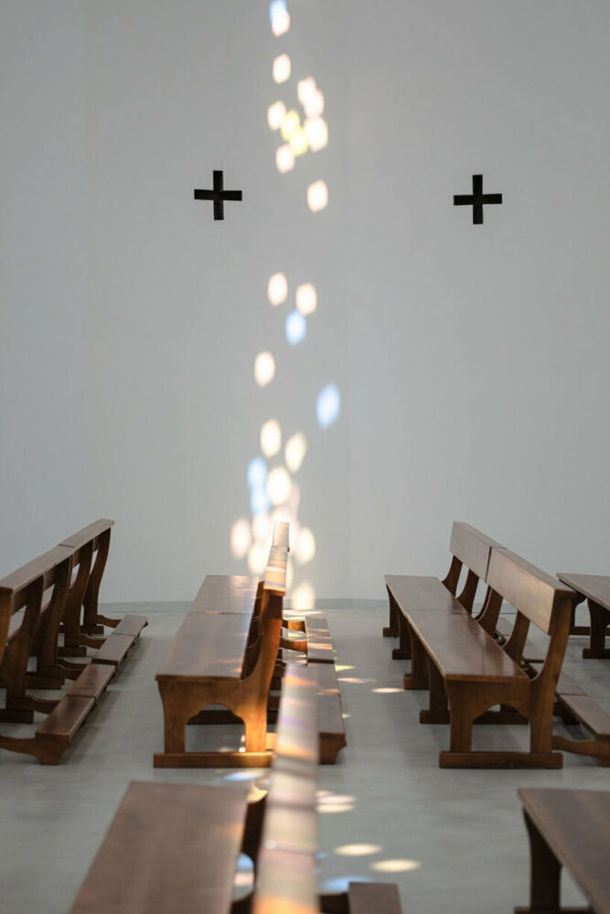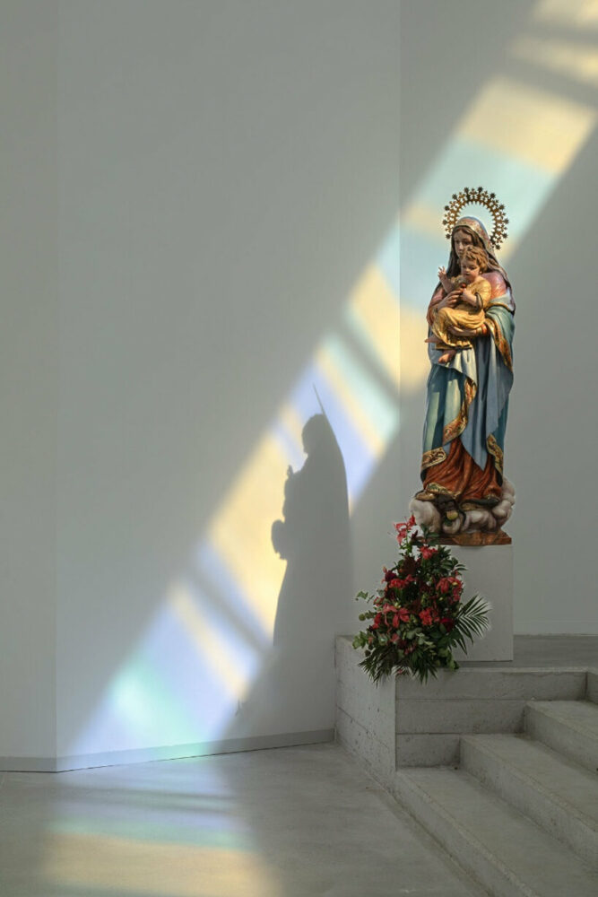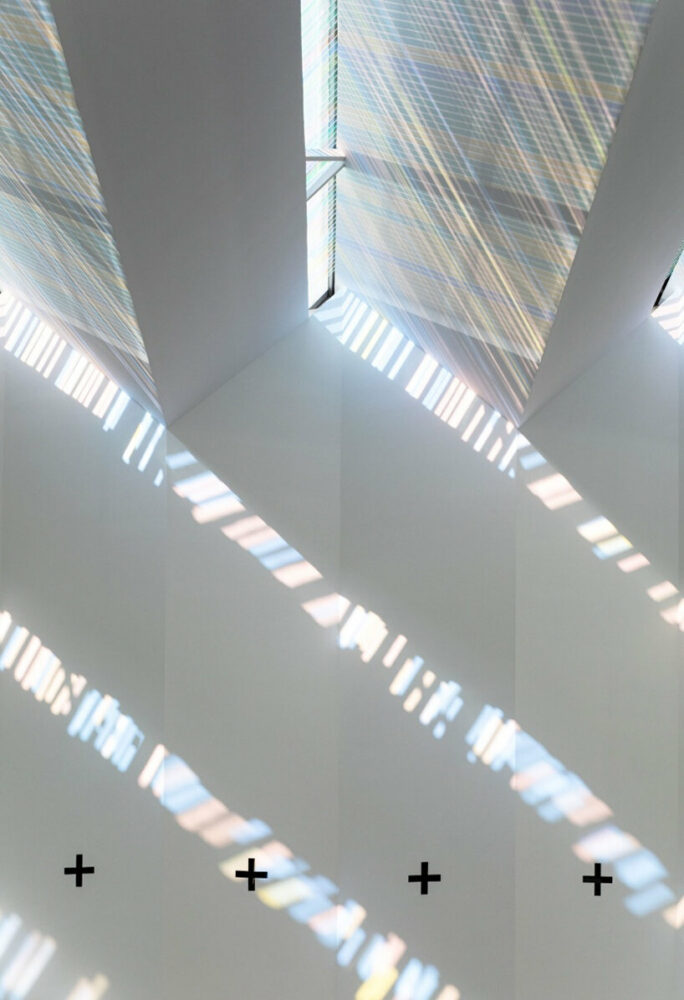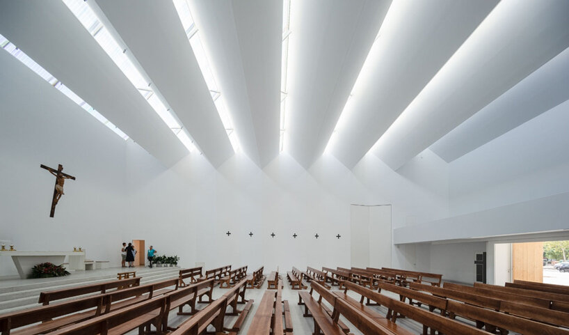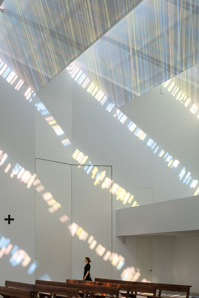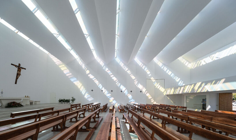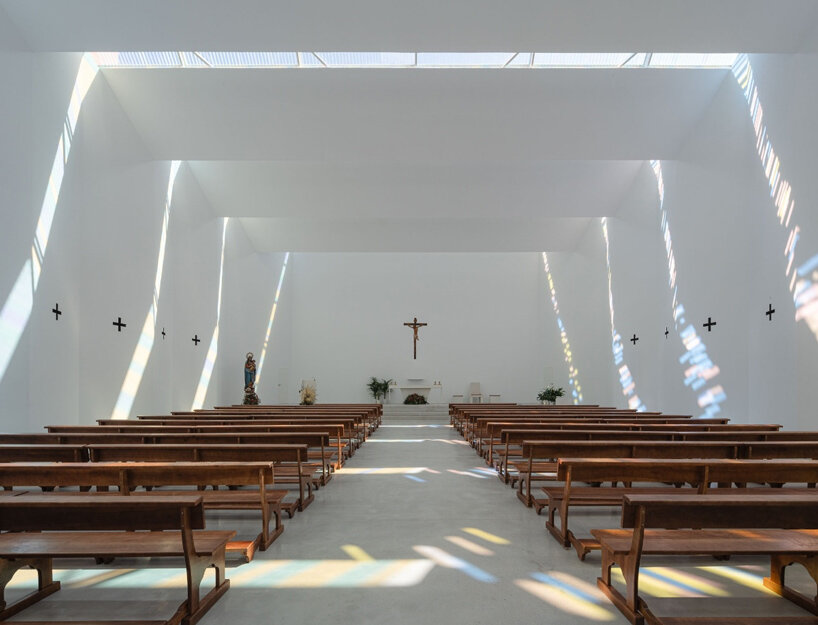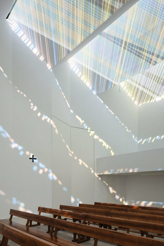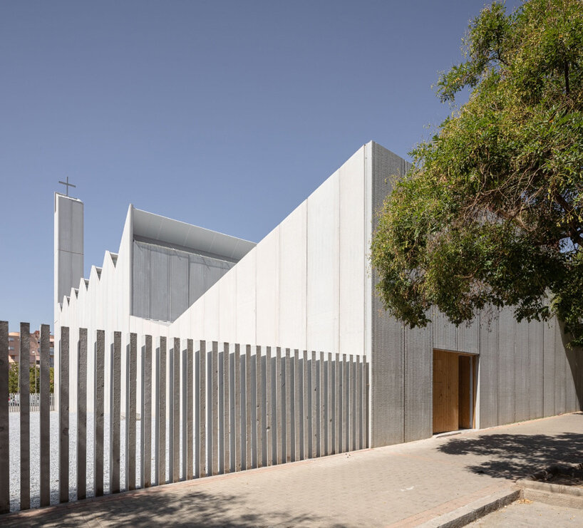 Located on the outskirts of Granada, Spain, Elisa Valero‘s Holy Spirit Parish takes shape as a religious center with a simple yet inviting architecture. The project, developed over a span of 14 years, aimed to create a functional space for prayer within budget constraints. Thus, the exterior of the church presents itself as a concrete box topped by a jagged roof, while in the corner of the structure, a slender tower rises subtly towards the sky. Internally, the uneven roof generates an intriguing play with light as it filters through the peaks and diffuses in linear shapes with pastel hues, casting intricate patterns on the walls. Captured by architectural photographer Fernando Alda, this mesmerizing effect creates a sense of holiness yet welcomes prayers in a warm and tranquil environment.