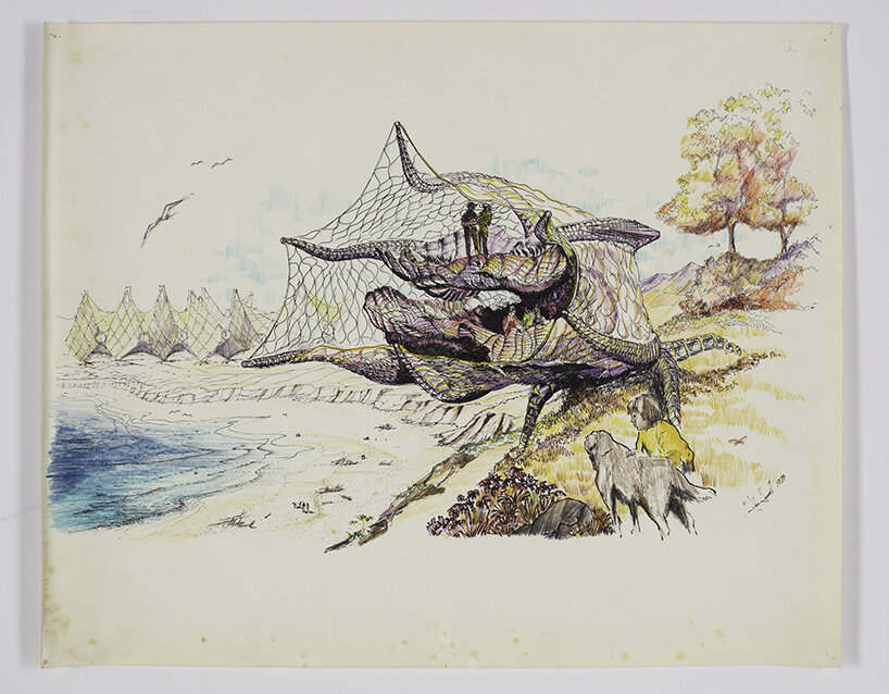 Eugene Tssui (1954) Venturus | wind-generated dwelling for Mr. and Mrs. Peter Cook, Victoria, BC, Canada (1982) | elevation and section through entrance tunnel | watercolor, prismacolor pencil, pastel chalk, and colored ink on paper, 53.3 × 81.3 cm | © Collection Eugene Tssui