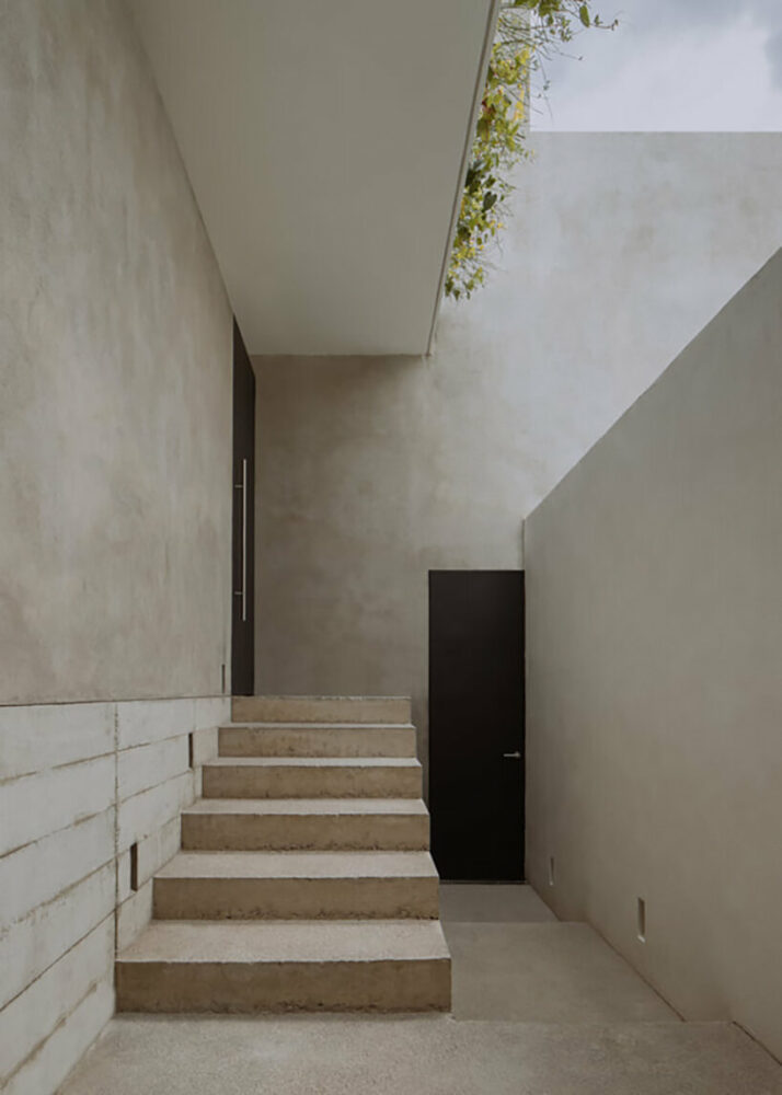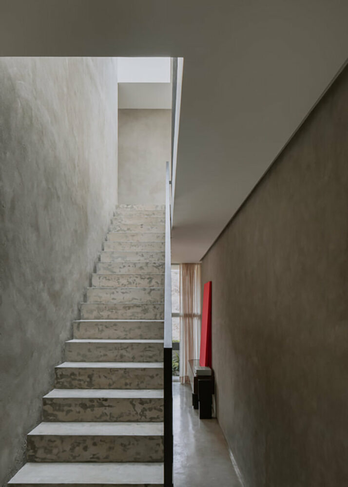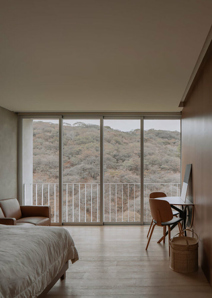 Sited on a sloping terrain, facing a reserve with a ravine and river in Naucalpan, Mexico, ‘Casa de la Cañada’ by Escobedo Soliz exemplifies building a home on natural topography. Developed downwards, the construction takes advantage of the existing inclination — leading to one level above the sidewalk and two below it. Bedrooms, bathrooms, dressings rooms, and a gaming room occupy the top level, while the first below it is the ground floor, where a public area and kitchen welcome residents and guests. Finally, at the lowest level, a central patio appears, hosting an open-air kitchen and a semi-covered pool.