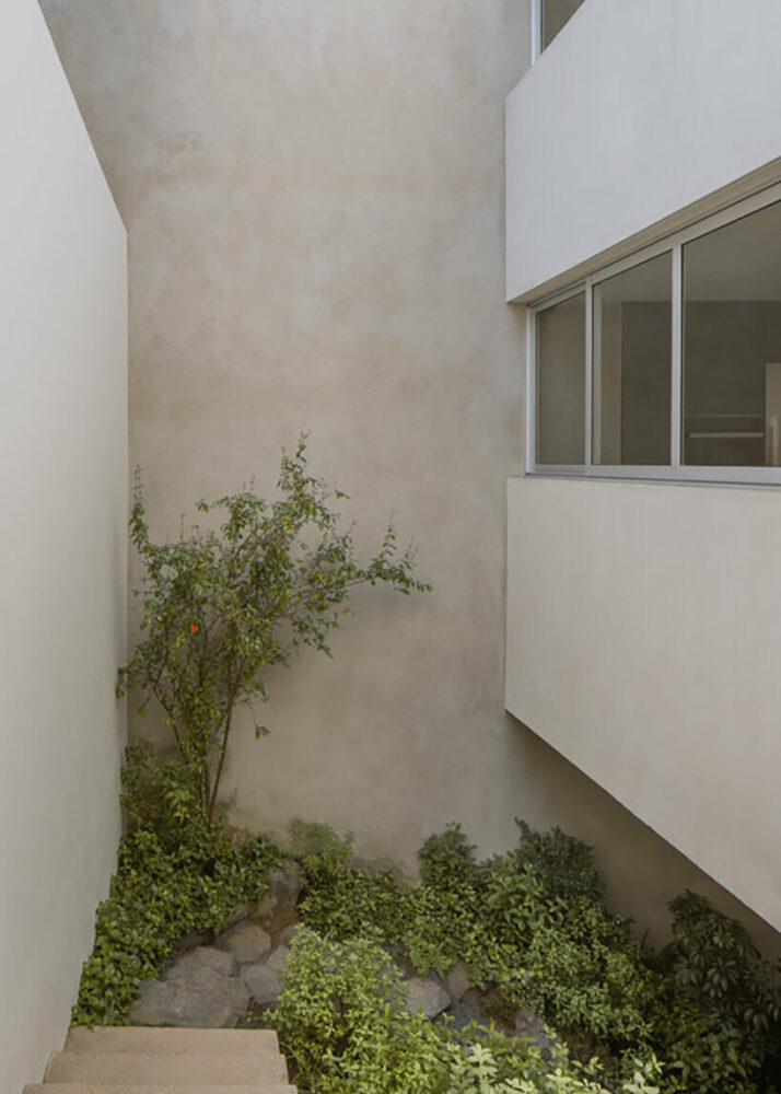 These white volumes composing the house include the main living spaces and open from side to side towards the ravine and the interior patios. Last but not least, the structuring of ‘Casa de la Cañada’ has been resolved based on rigid concrete frames with enclosing masonry walls, joists, and vault slabs. The foundation is based on continuous footings staggered with the slope of the land and retaining walls. ​