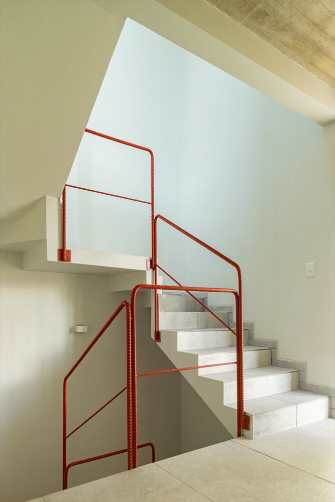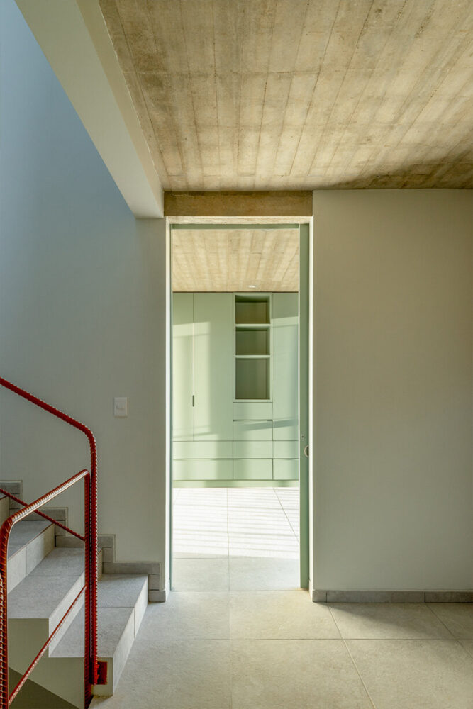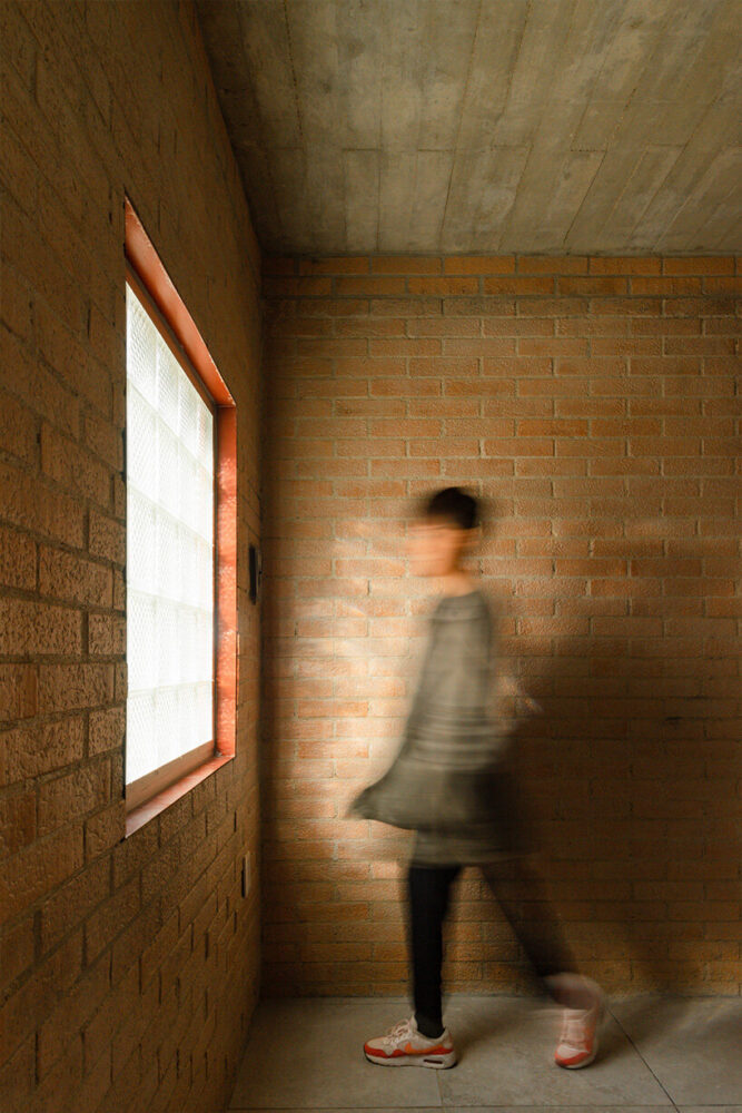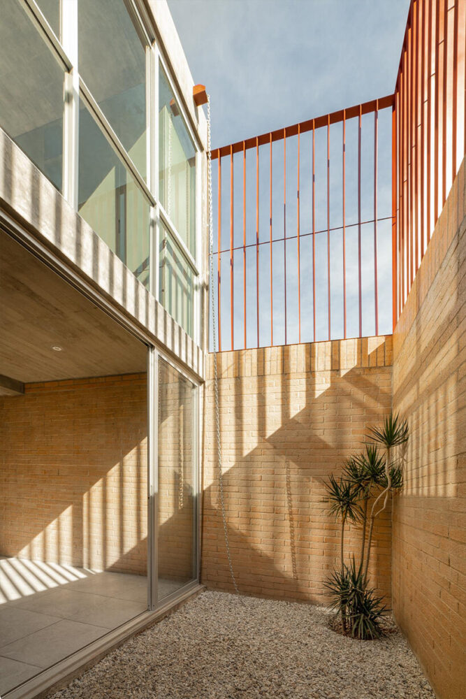 the project sits like a ring placed over the terrain, with its funnel-like roof forming a shaded perimeter walkway and an introverted core.