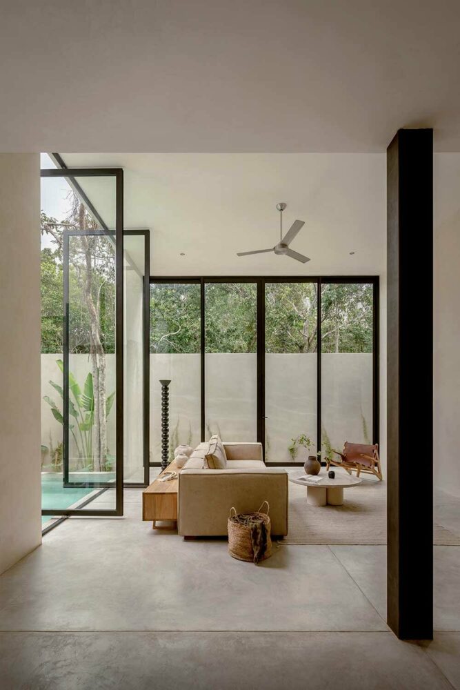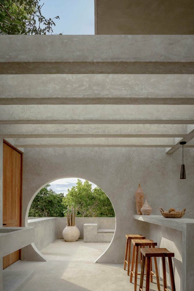 The design team sought to create architecture that comes in harmony with the surrounding setting, all the while considering construction regulations, tropical climate conditions, existing vegetation, and the potential for hurricanes. Thus, the materiality choice has pared back to raw wood-formed concrete, ‘which is slowly uncovered to reveal itself as a carved sculpture.’ The team at Espacio 18 Arquitectura added:‘The construction regulations and existing trees influenced the outline of the house, while the jungle views were considered to ensure complete privacy.’