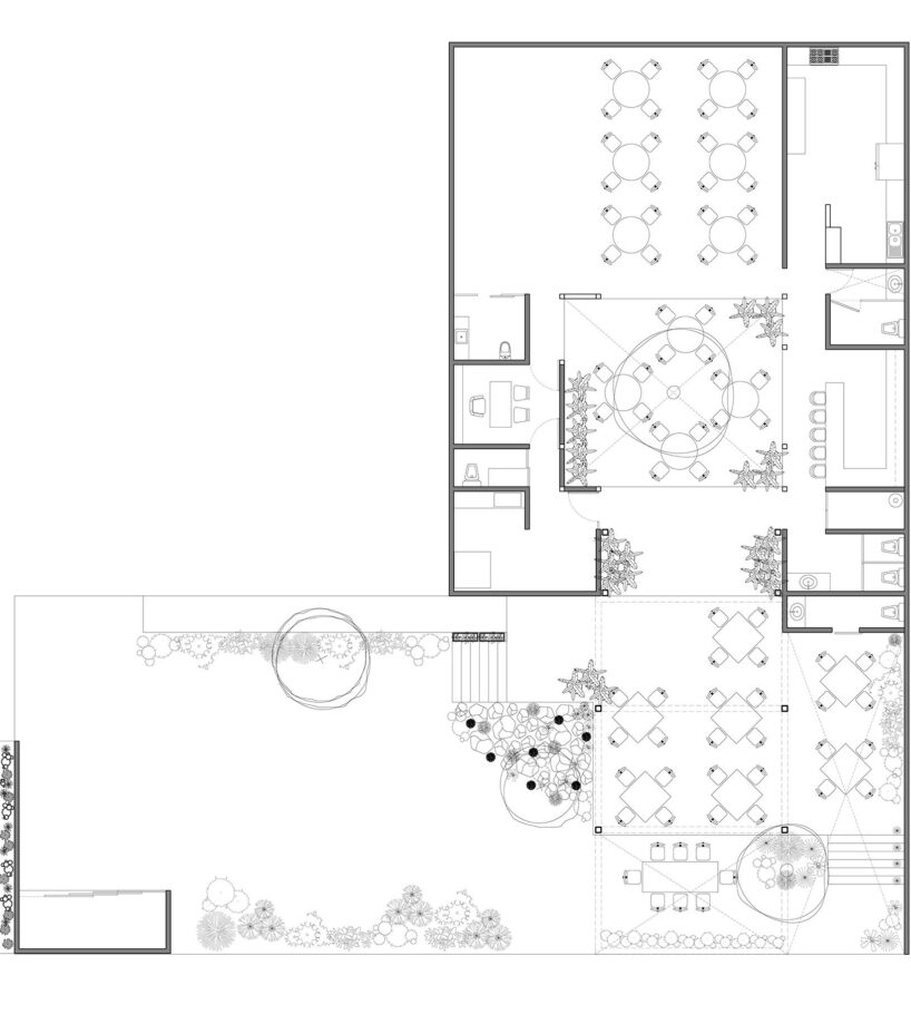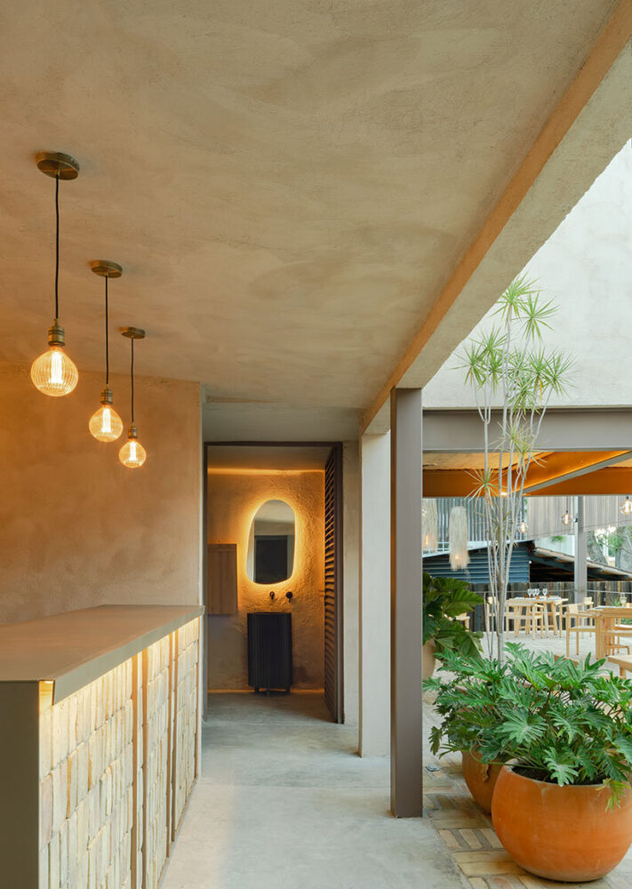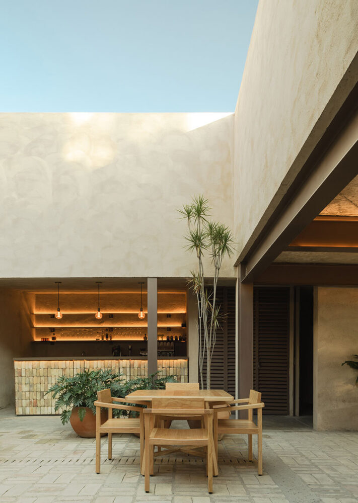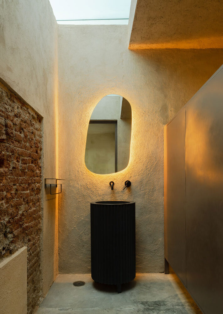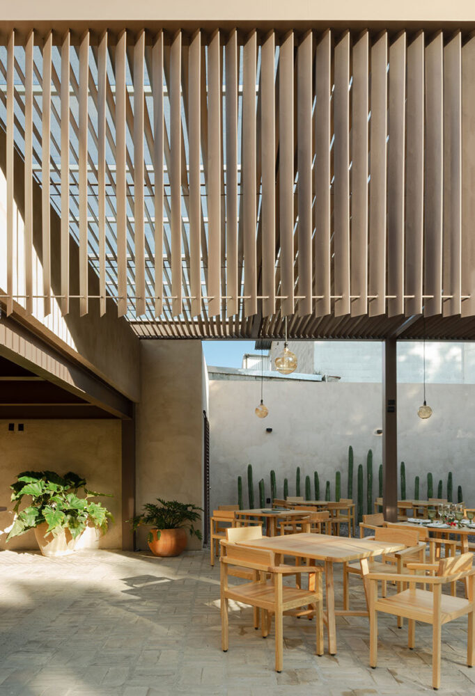 the project sits like a ring placed over the terrain, with its funnel-like roof forming a shaded perimeter walkway and an introverted core.