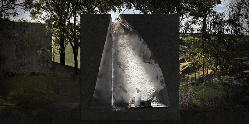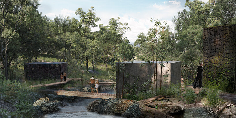 ‘Connected through a wooden pathway that links both sides of the river, these sculptural elements materialize as stone volumes lost in nature. Through the open-air hot springs, the user transits between outdoors and indoors, experiencing the range of temperatures,’ notes the architects.
