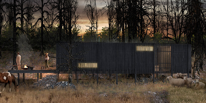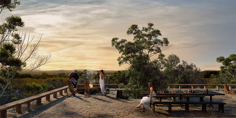 On a young forest hillside, cabins are spread to the west of the property, where guests can catch a glimpse of the horizon through thin tree trunks. Inspired by the traditional open 3-stone fire — a resource of great importance for the historical and cultural legacy of the communities in the area — the shelters are surrounded by pristine nature, and their wooden facades blend in with the landscape going unnoticed by hikers. They merge with the forest in the dark, and the light emanating from inside flutters like fireflies at night. The pile system allows an easy set-up on any slope or terrain, and the narrow proportion seeks to avoid the existing trees, respecting the premise of having a minimal impact on the site.