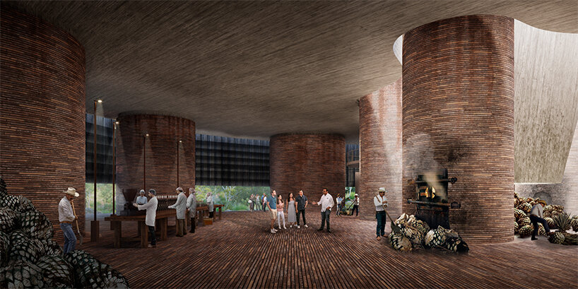 In an operative and theatrical action, the agave piñas are thrown from the jimador area through a sizeable conical funnel, placing them in the center of the space between the ovens; the distillation process develops radially from this point. A large burnt wooden lattice embraces the construction, creating a protective barrier against the sun rays and filtering the light, favoring natural ventilation to provide the necessary environment for fermentation.