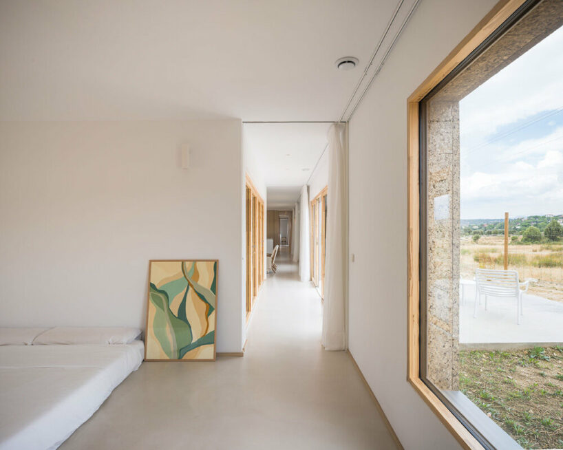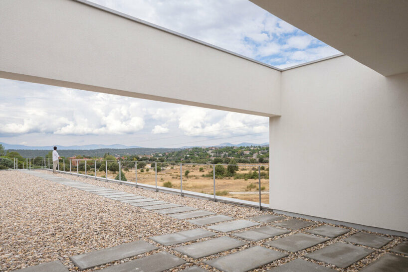 Within a 1,800 square-meter property with slight elevation variation, Casa Eñe extends as a rectangular box, facing a large holm oak tree at its center. To the north, a 55-meter-long green wall made of Arizonica trees conceals a lush park stretching into the distant mountains, replete with holm oaks, rockroses, and junipers. To integrate the greenery into the property, the team at Estudio Albar removed the lush wall, making the house part of the park and connecting it to its natural environment. Spanning 40 meters long and 6 meters wide, the house features large square windows on its main facades, providing views of the landscape to the north and welcoming sunlight from the south. The two smaller facades, on the other hand, remain solid and unadorned.