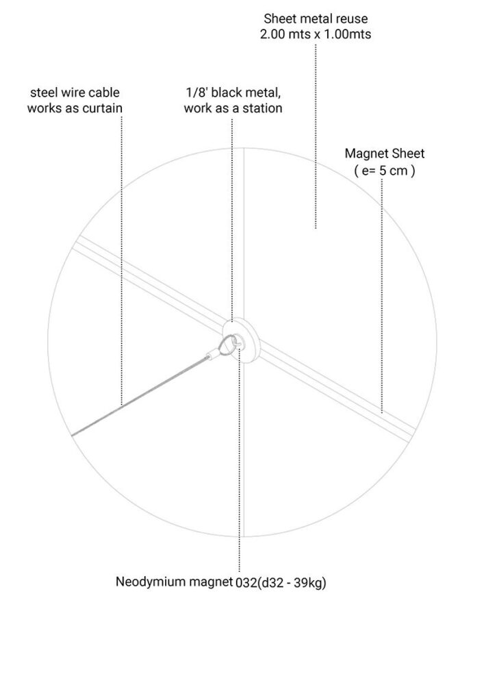 the third goal was to use magnets as a construction system. the client already had metal sheets of 1 x 2 meters that were reused to cover the entire interior. a 5cm thick magnetic strip was then added around the room to hang curtain partitions, shelves and other items.