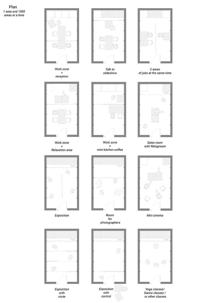 the project focuses on three objectives. the first goal was to show how a small area can have a variety of uses, offering greater flexibility and transformability. for example, MCM can be used as a workplace, a clothing store, a place to teach, a photography studio, an art gallery, or a micro cinema.