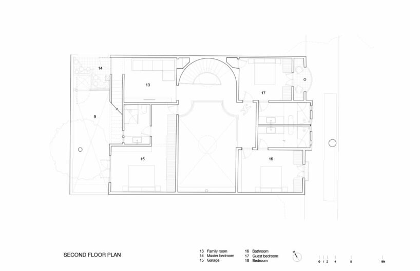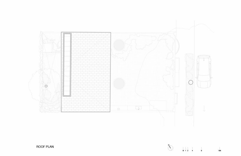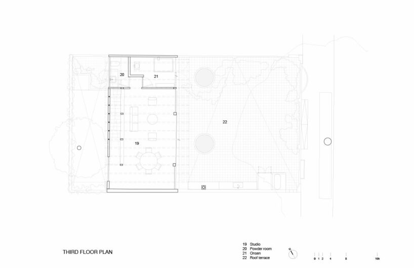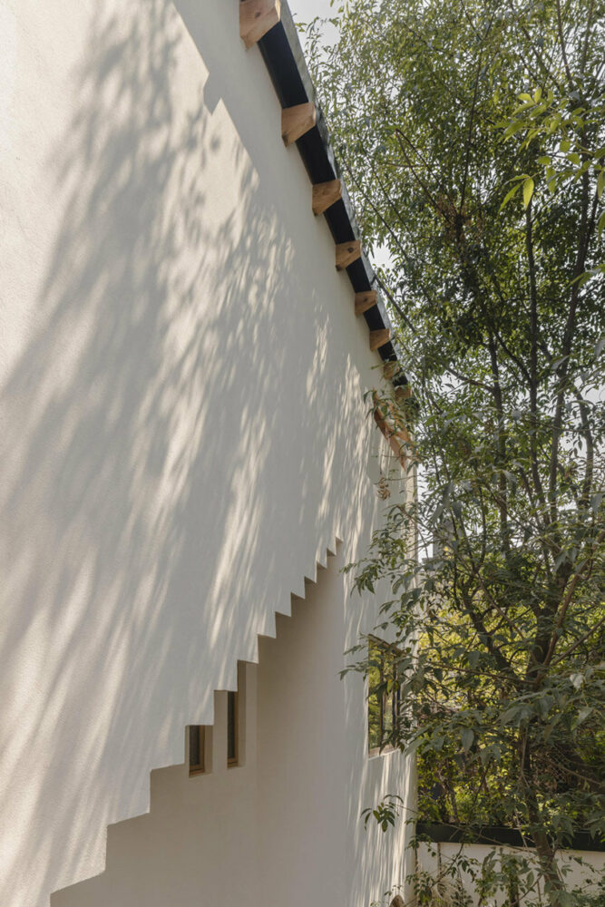 the project sits like a ring placed over the terrain, with its funnel-like roof forming a shaded perimeter walkway and an introverted core.