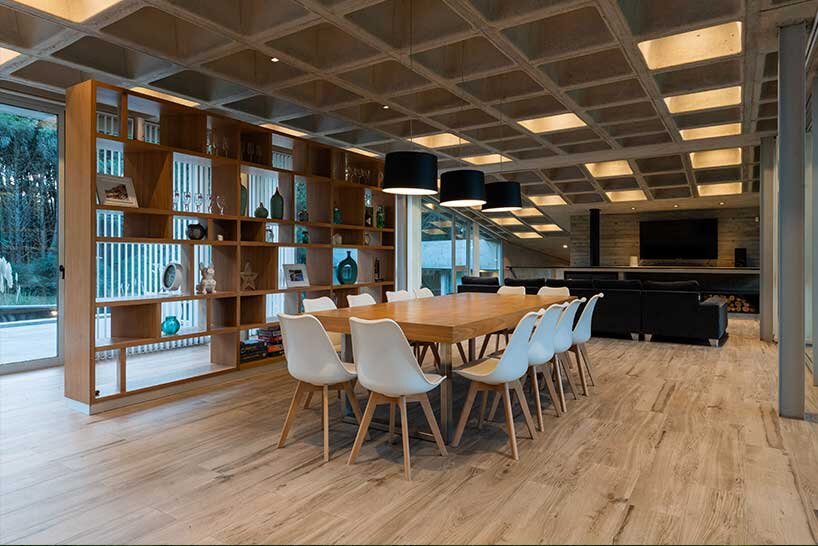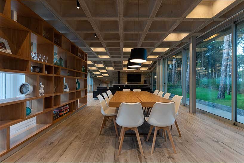 the interior is characterized by the waffle ceiling embedded into the concrete slab, providing an impressive visual contrast with the seamless wooden flooring. the ceiling grid offers a sense of openness and tranquility, while some of the cubes feature hidden lighting and when dark, create a playful atmosphere.estudio galera builds concrete house in argentina by proposing but not imposing uses