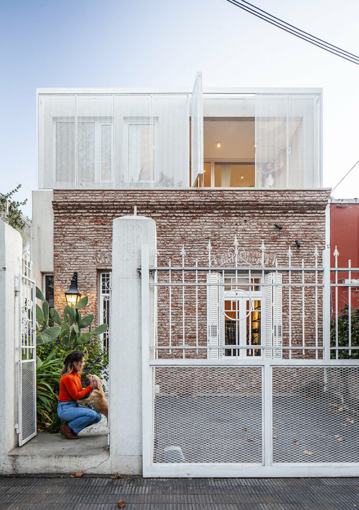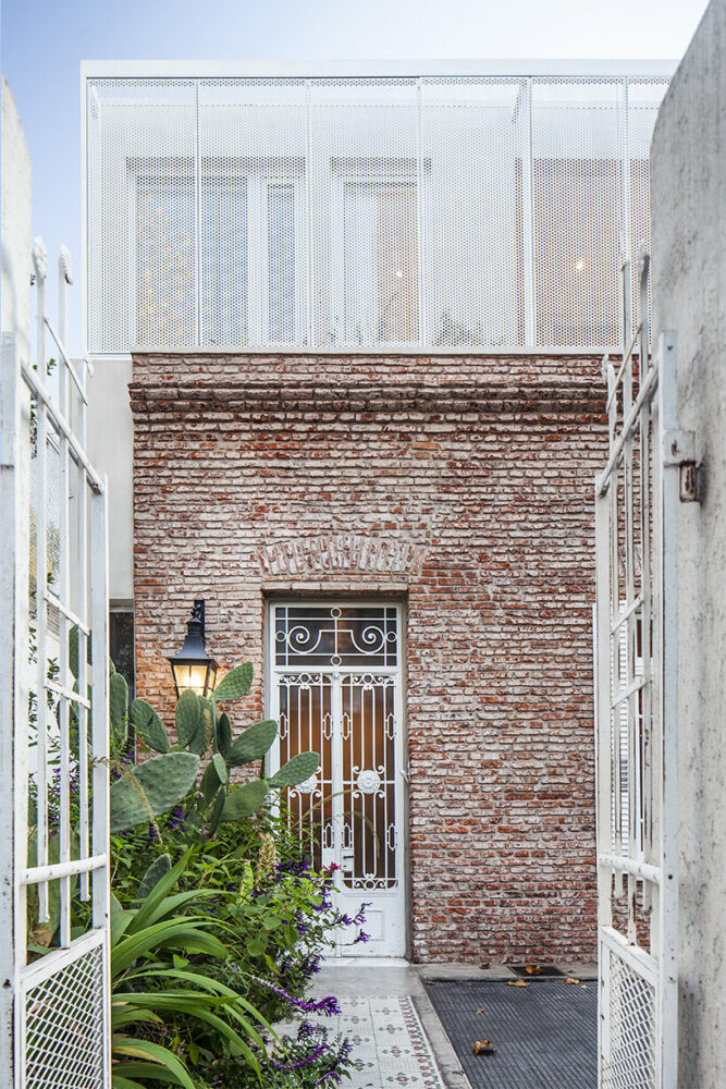 The architects at Estudio PK develop the Casa Hormiga restoration to celebrate both the heritage of the house and the contemporary addition. With this spirit, the team leaves the brick façade exposed so that the original construction — once covered over with a white finish — can be seen. Above, the upper floor is built with balloon framing and white sheet metal cladding. The perforated screen shows at the front of the house, transforming the space with its folding shutters. the team writes: ‘the duality of what was (the base of the existing house) and what is new can be seen: the structure of sliding folding sheet metal shutters that gives dynamism to the facade.’