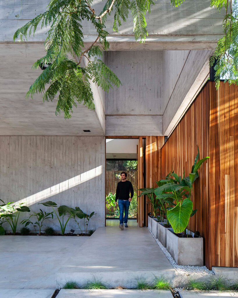 the project sits like a ring placed over the terrain, with its funnel-like roof forming a shaded perimeter walkway and an introverted core.