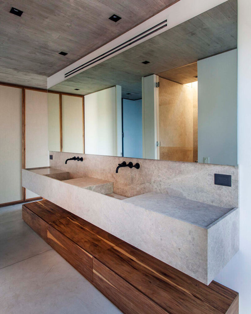 argentina-based architects at estudio PKa complete a dwelling in buenos aires dubbed casa E. sited on a corner lot in the neighborhood of barrio isla del sol, the house is made up as a composition of timber, concrete, and glass volumes. the design of the project sees the team’s response to the atypical dimension of the plot, and is organized as an L-shaped bar filled in with two intimate garden patios. while one of these gardens surrounds the L-shaped volume, another is nestled within it and is occupied by a lagoon-like swimming pool.