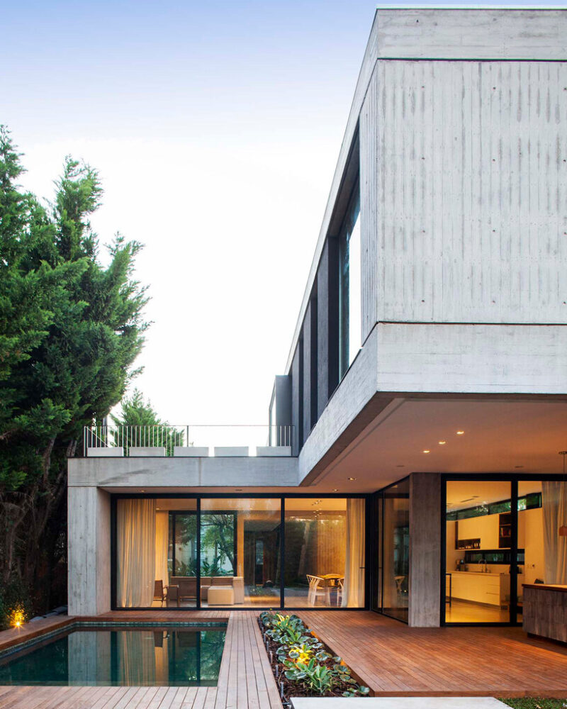 this house in buenos aires is a concrete box that floats above a garden lagoonfull-height glass opens up the interiors and invites views of the gardens inside