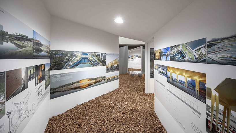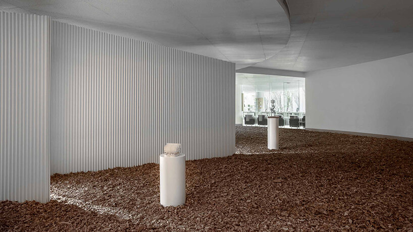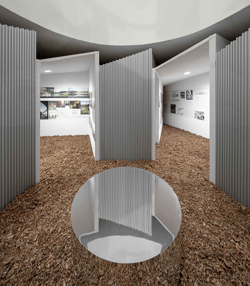 the project sits like a ring placed over the terrain, with its funnel-like roof forming a shaded perimeter walkway and an introverted core.