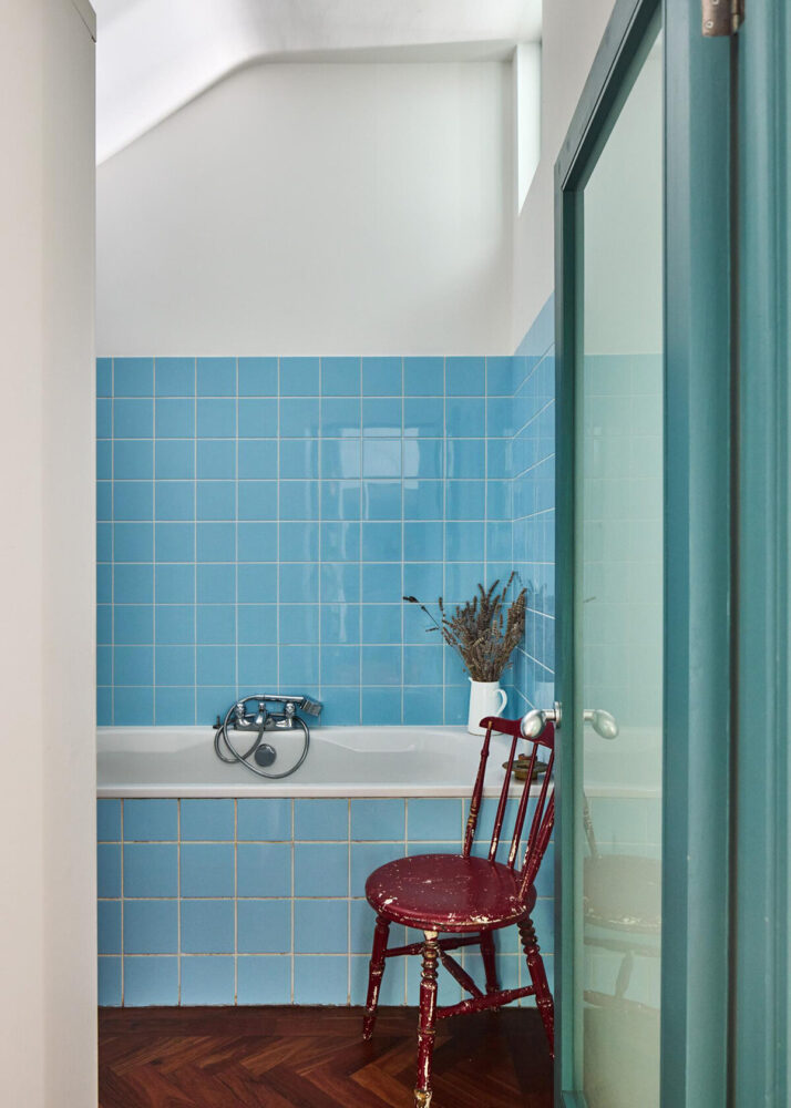 This upper level references the family’s time on the coast and brings a textured contrast to the smooth blue facade below. The combination of these elements reinforces the home’s layered identity, shaped by phases of personal history and architectural experimentation.