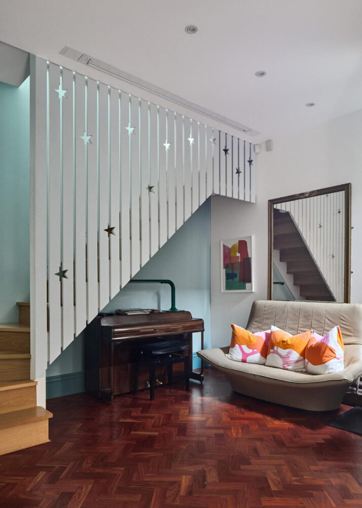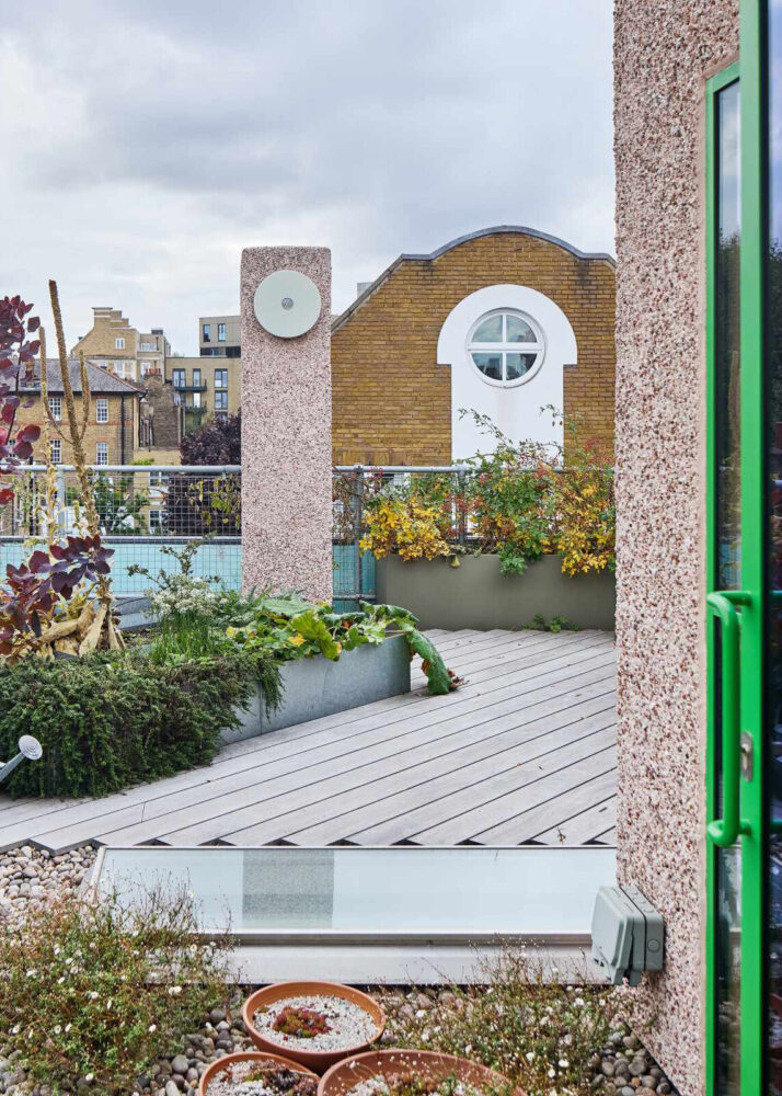 Atop the main Blue House, a later addition by Griffiths’ current practice, ModernArchitect, introduces a rooftop studio and terrace. Pebbledash clads the volume, edged in yellow and cut by a green-framed pivot door that sets a bold datum against the sky. Inside, a deep portal window aligns with this frame, giving the studio a strong outward focus and a sense of orientation within the wider streetscape.