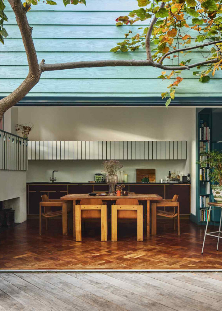 At the rear, the kitchen opens directly to a sheltered courtyard garden planted with lush tree ferns and small tetrapanax trees. Large bi-fold glazing draws the garden into daily life, allowing light and foliage to settle into the interior. The interaction between these spaces brings a grounded quality to a home often framed through its expressive exterior.