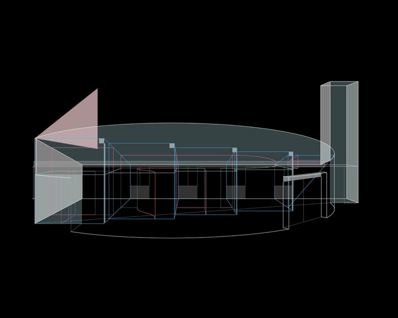 The volume of the house is an intriguing assemblage of two distinct figures — an inclined half-circle and a slender spire. The surfaces, despite sharing the same color palette, never meet, creating a visual tension. The interplay of white, black, and blue hues revolves around the complex form, and a pink triangular chimney playfully lands on the slanted roof, adding a whimsical touch to the exterior.