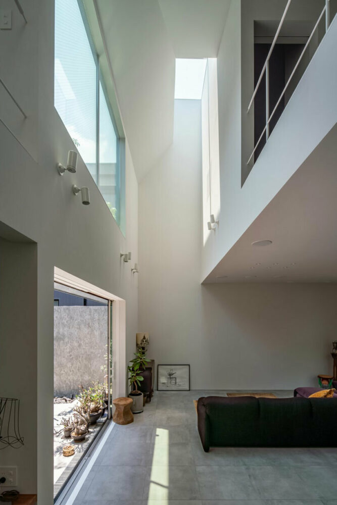 The key element of this project is the way Suzuki Takamasa Architects has crafted natural light into the space. Each of the five volumes is topped with a generous skylight and a chimney-like roof, which was shaped to avoid excessive solar gain. Five voids have also been planned through the section to allow natural light from the roof lanterns to reach the first floor below. The top light creates a play of light and shadow throughout the house that changes according to the time, season, and weather, adding depth to the continuous space. The architect’s idea is that the different atmospheres and shades of light create diverse spaces to inhabit.